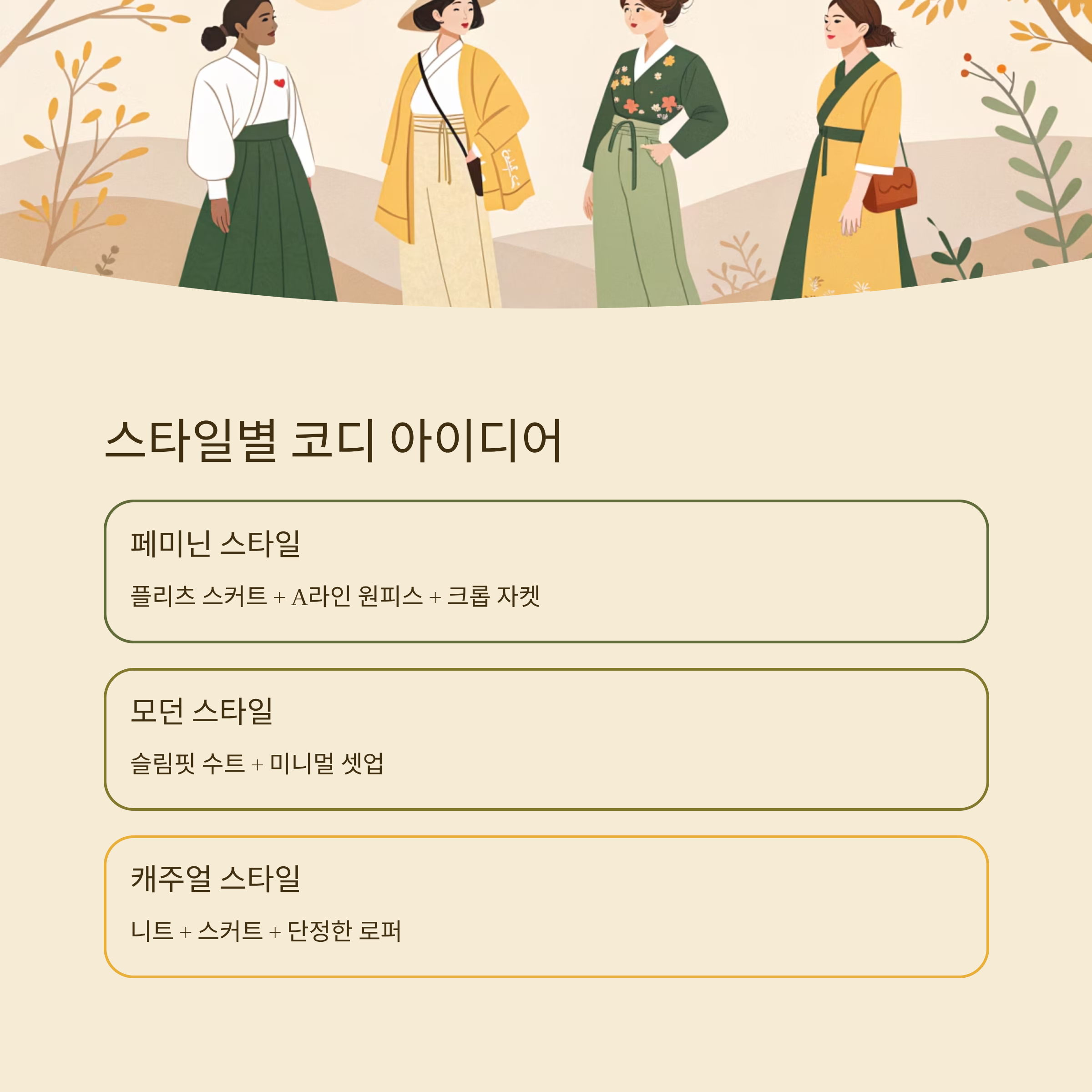 페미닌한 스타일을 좋아한다면 플리츠 스커트나 A라인 원피스가 잘 어울려요. 여기에 크롭 자켓을 걸치면 단정하면서도 가을 무드를 살릴 수 있어요. 모던한 스타일을 원한다면 슬림핏 수트나 미니멀한 셋업을 선택하는 게 좋아요.