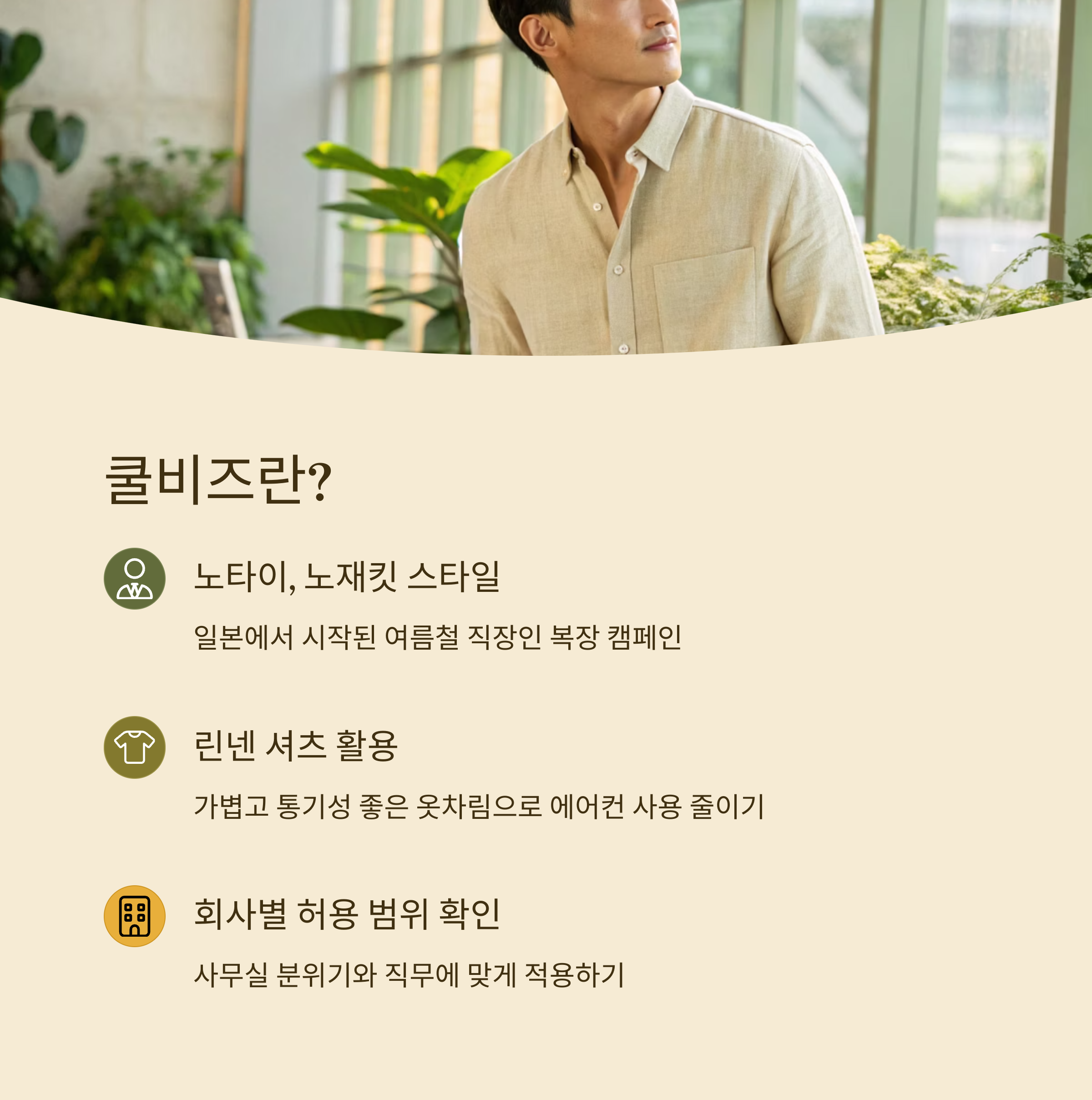 쿨비즈(Cool Biz)는 일본에서 시작된 여름철 직장인 복장 캠페인이에요. 전통적인 수트 대신, 가볍고 통기성 좋은 옷차림을 장려하면서 에어컨 사용을 줄이기 위한 환경 운동의 일환으로 시작됐죠. 이제는 우리나라를 비롯한 여러 나라에서도 쿨비즈 스타일을 적극적으로 도입하고 있어요.