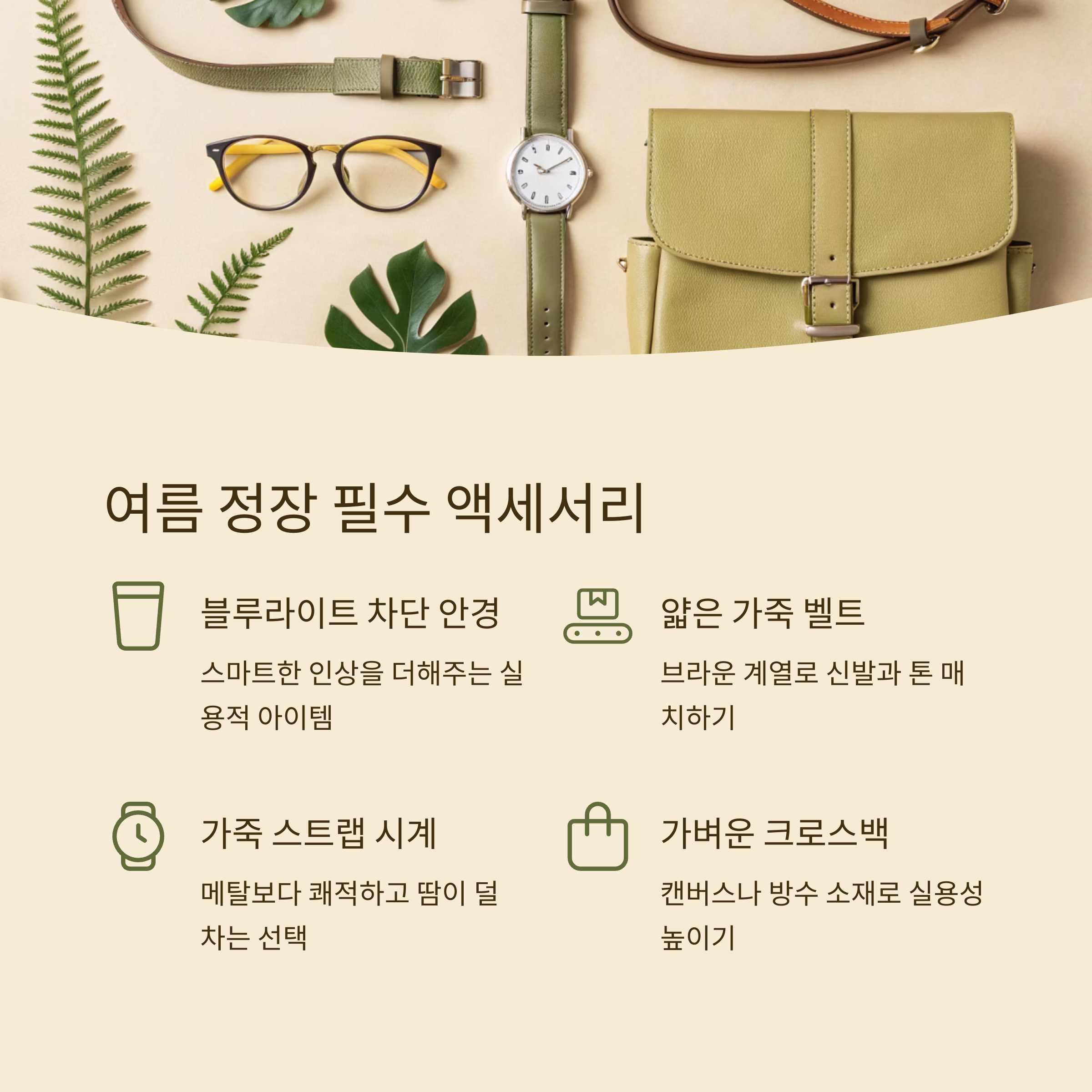 여름 정장 코디에서 스타일을 살려주는 마지막 터치는 바로 '액세서리'예요. 과하지 않으면서도 정장의 분위기를 해치지 않는 아이템으로는 얇은 벨트, 가죽 스트랩 시계, 블루라이트 차단 안경 등이 있어요. 특히 안경은 스마트한 인상까지 더해주니까 정말 유용해요.