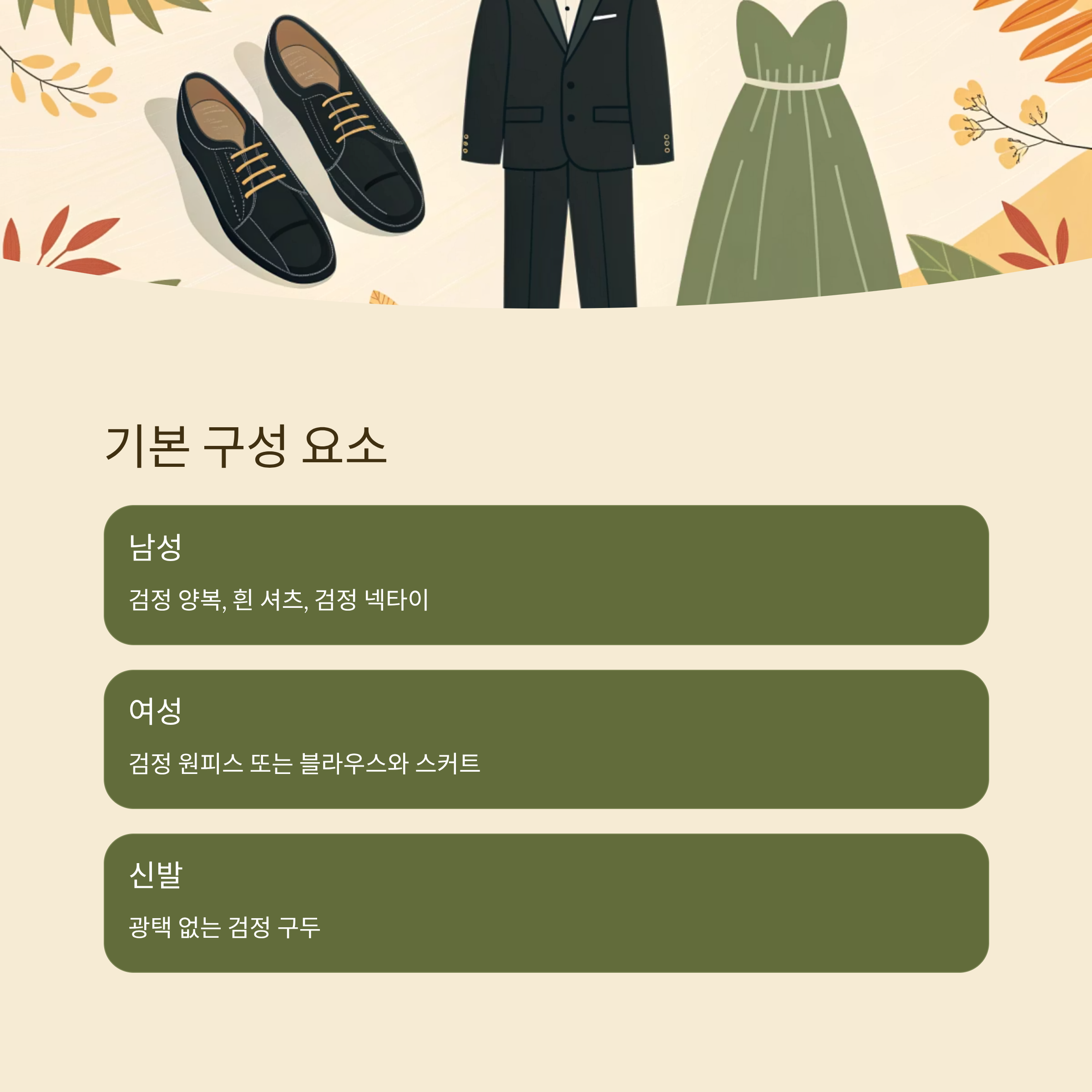 여성의 경우 블라우스와 스커트를 조합하거나 원피스를 선택할 때, 화려한 패턴이나 장식이 없는 단색을 고르는 것이 예의에 맞아요. 남성은 반드시 흰 셔츠를 입고 검정 넥타이를 매는 것이 기본이에요.