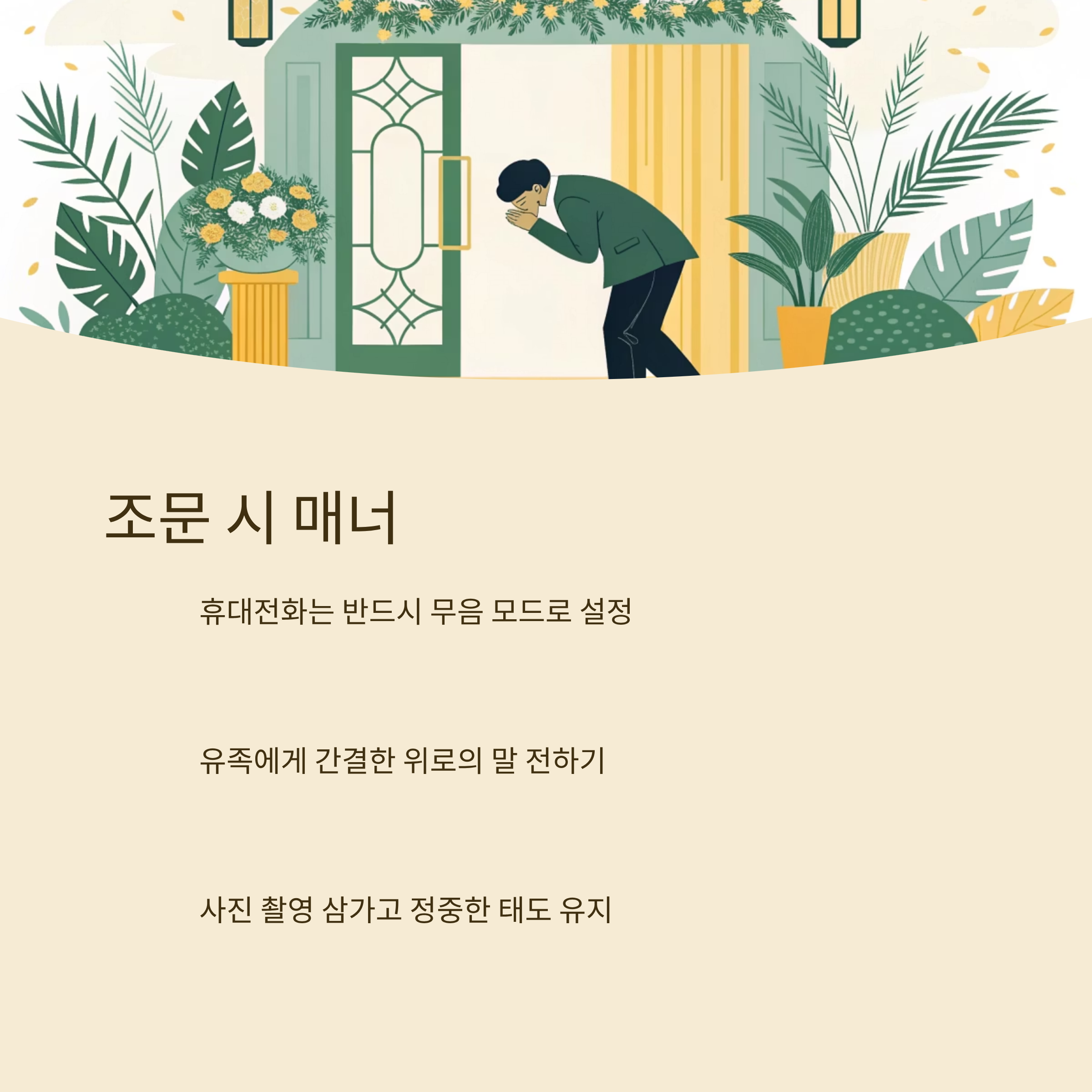 휴대전화는 반드시 무음 모드로 해두고, 조문 중에는 사용하지 않는 것이 예의예요. 사진 촬영도 피하는 것이 기본이에요.