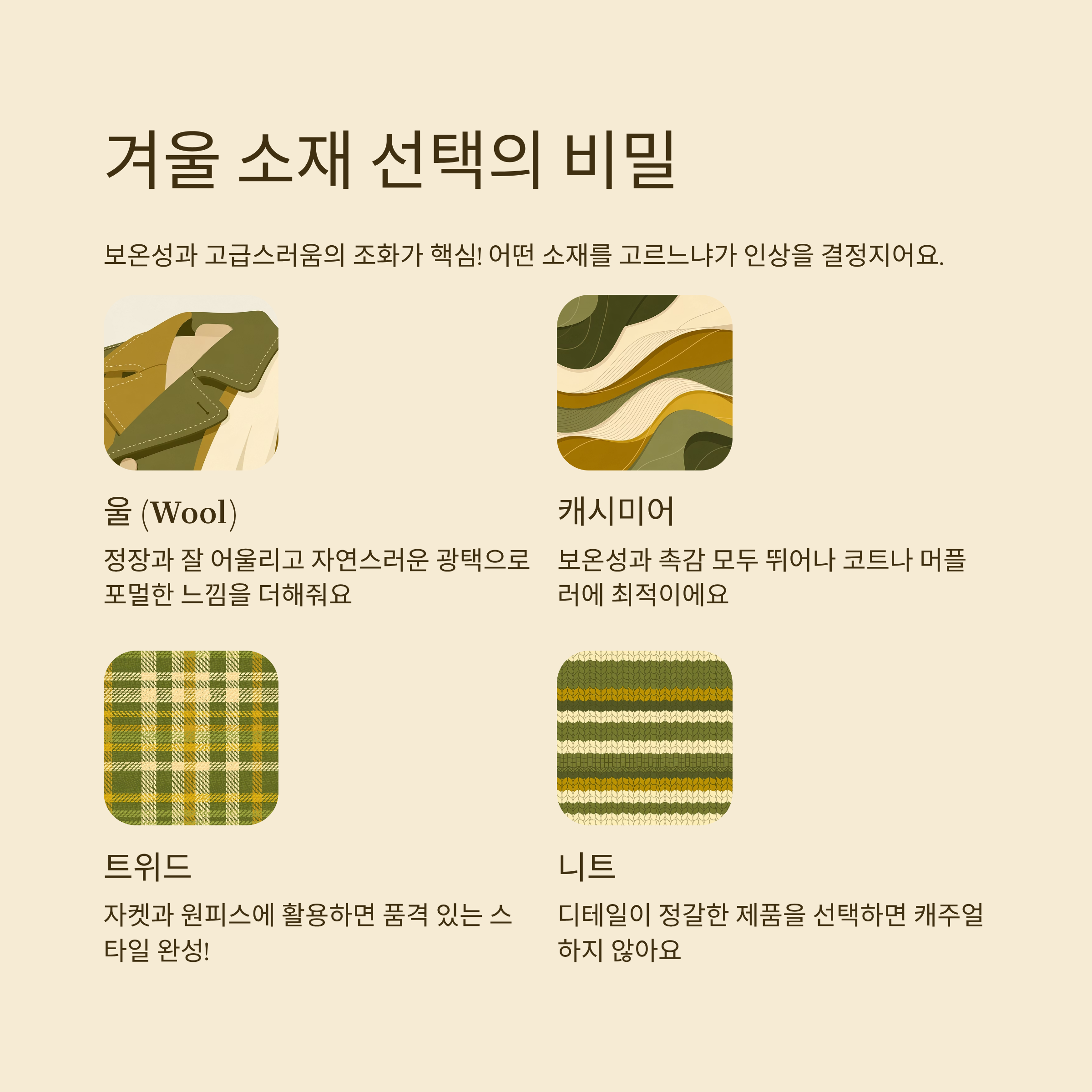 | 소재 | 보온성 | 고급스러움 | 추천 아이템 |