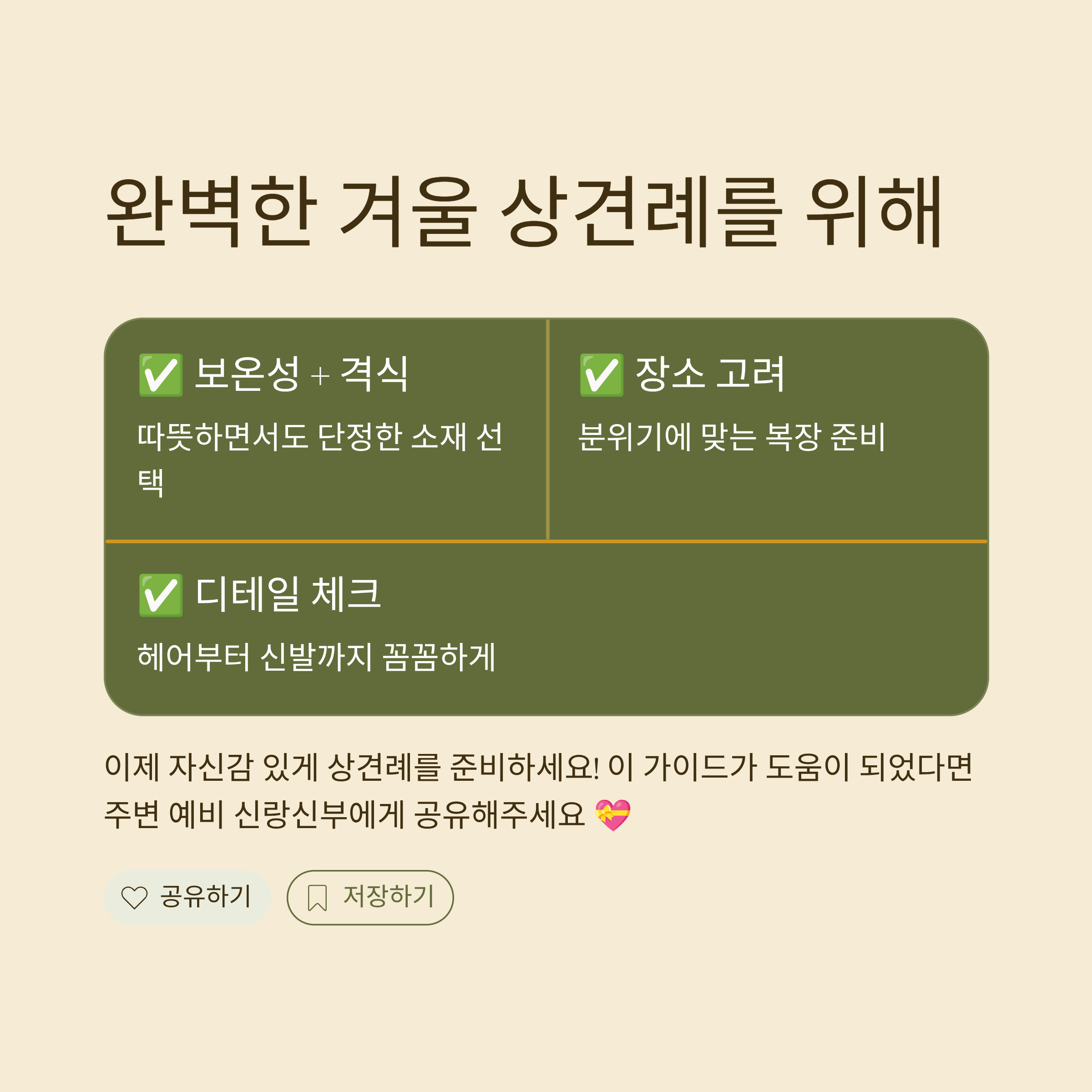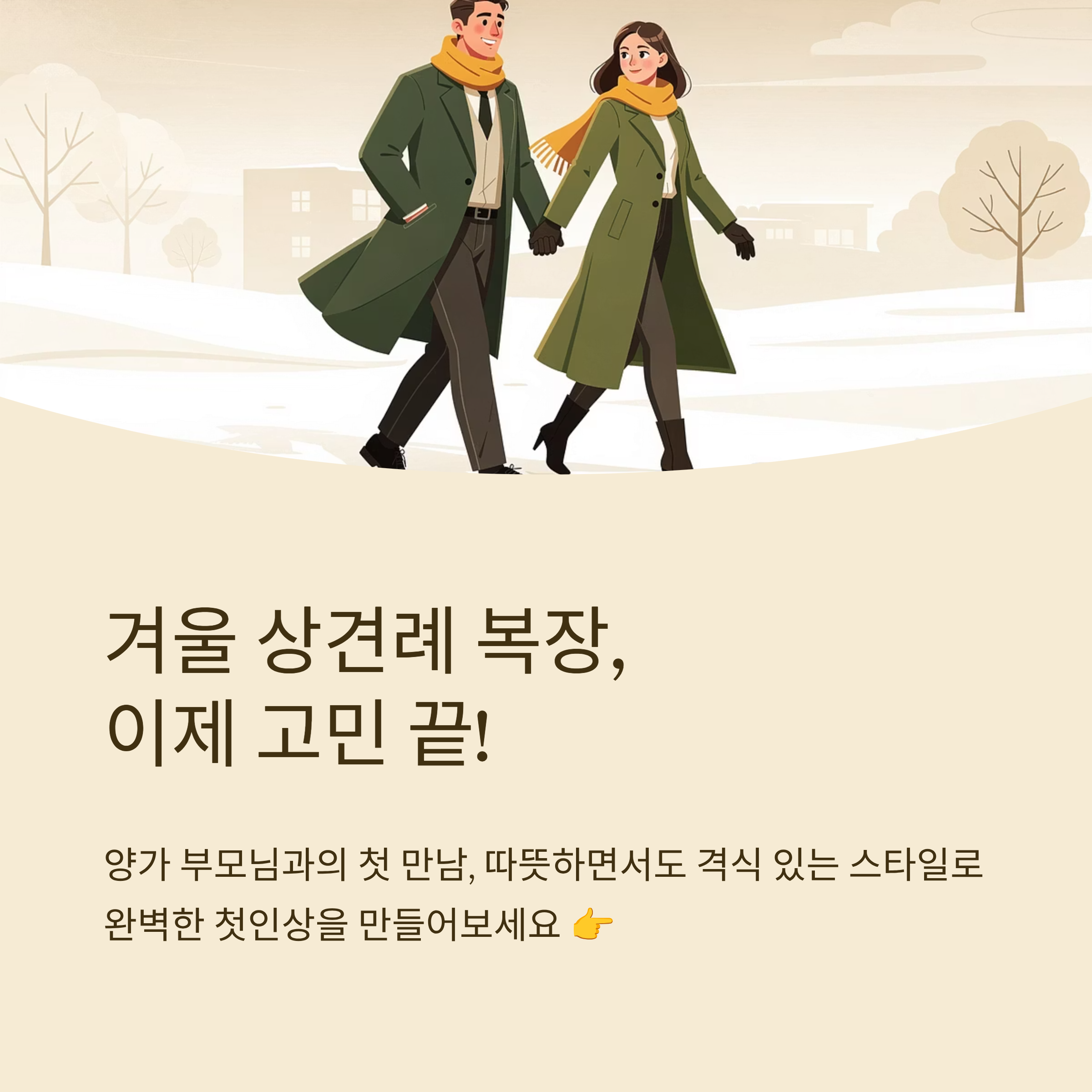 계절감이 반영된 복장은 상대방 가족에게도 센스를 인정받는 지름길이에요. ‘날씨도 고려했구나’ 하는 배려가 묻어나는 복장이야말로 최고의 인사죠. 계절에 따라 섬세하게 달라지는 스타일, 꼭 체크하고 넘어가야 해요!
