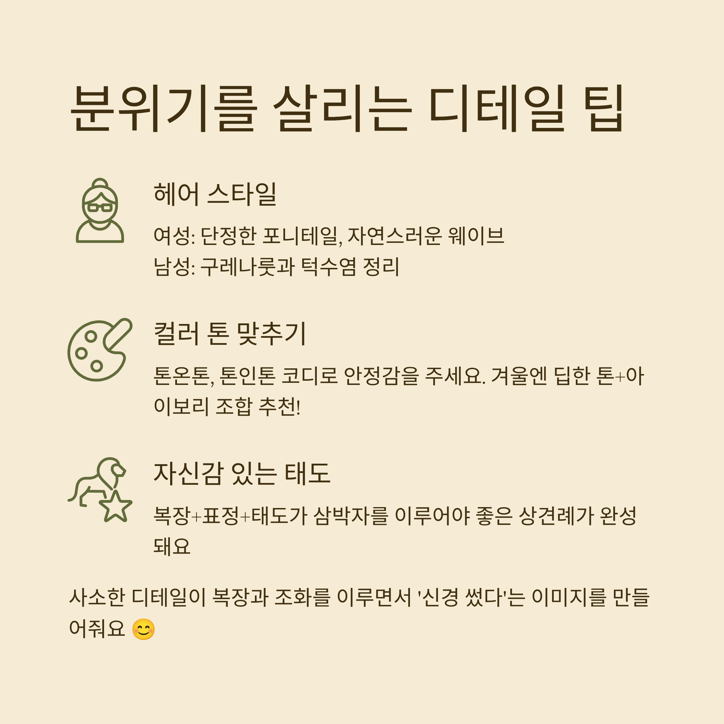 단정한 복장을 기본으로 하되, **분위기까지 챙기는 센스**가 있다면 완벽해요. 예를 들어 여성분들은 헤어 스타일도 중요해요. 단정한 포니테일, 자연스러운 웨이브, 정갈한 반묶음은 우아하고 단아한 느낌을 줄 수 있죠.