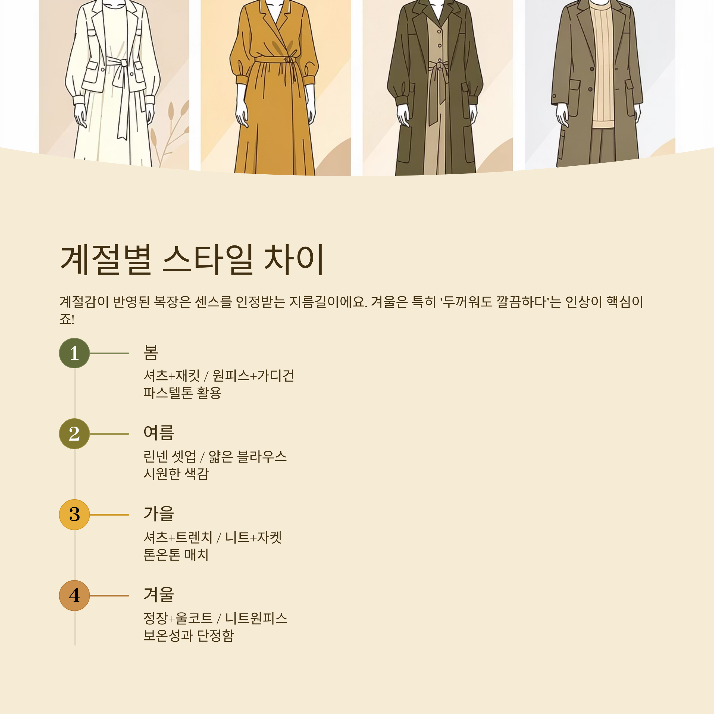 | 겨울 | 정장 + 울 코트 | 니트 원피스 + 핸드메이드 코트 | 보온성과 단정함 |