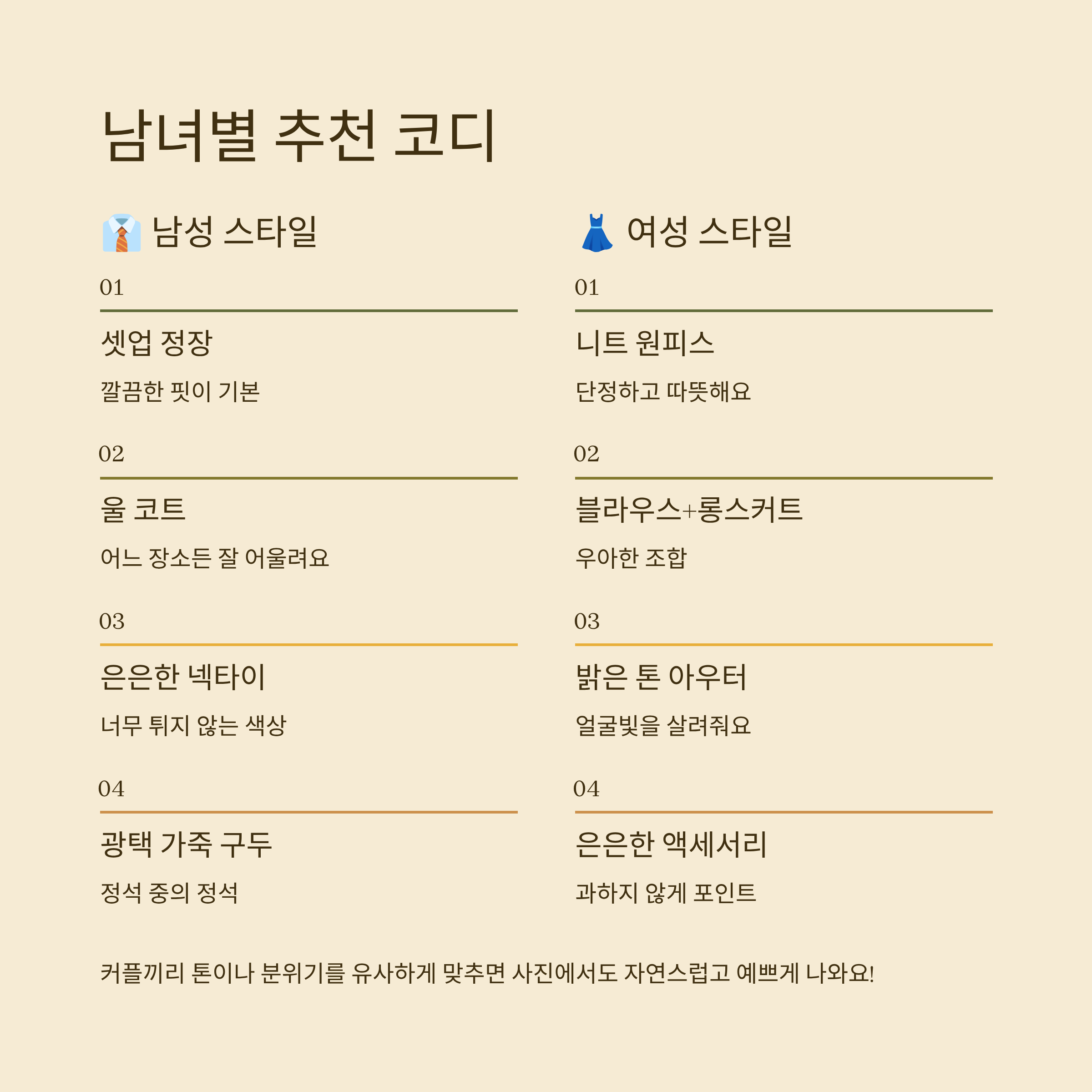 특히 커플끼리 너무 맞춰 입기보다는, 톤이나 분위기를 유사하게 맞추는 게 좋아요. 예를 들어 한 사람이 네이비 컬러를 입는다면 다른 사람은 아이보리나 베이지처럼 톤을 맞춰주면 돼요. 이렇게 하면 사진에서도 예쁘고 자연스럽게 나온답니다.