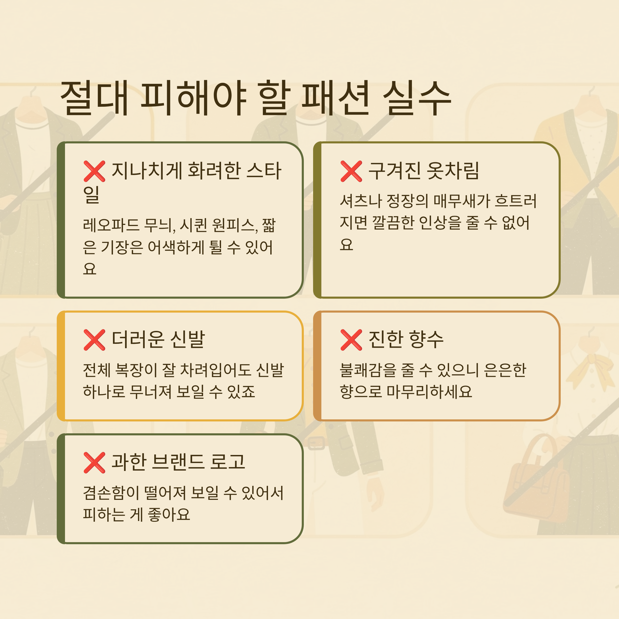 계절을 고려하지 않은 복장은 아무리 비싼 옷을 입어도 부자연스럽게 느껴질 수 있어요. 특히 겨울에는 너무 얇은 옷을 입으면 실내에서도 추워 보여서 걱정된다는 인상을 줄 수 있으니, 따뜻하면서도 단정한 스타일을 고민해보는 것이 좋아요.