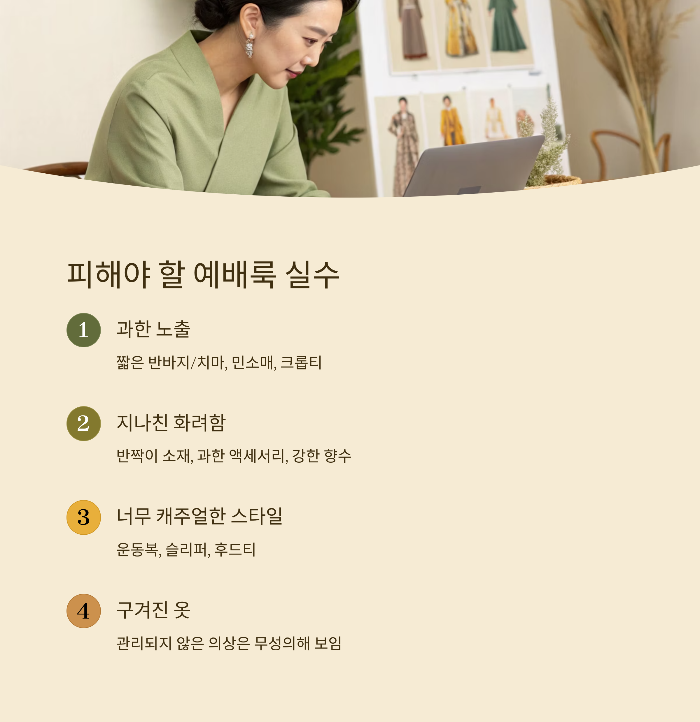 | 너무 화려한 스타일 | 반짝이, 향수 과다 | 은은한 톤앤무드 |