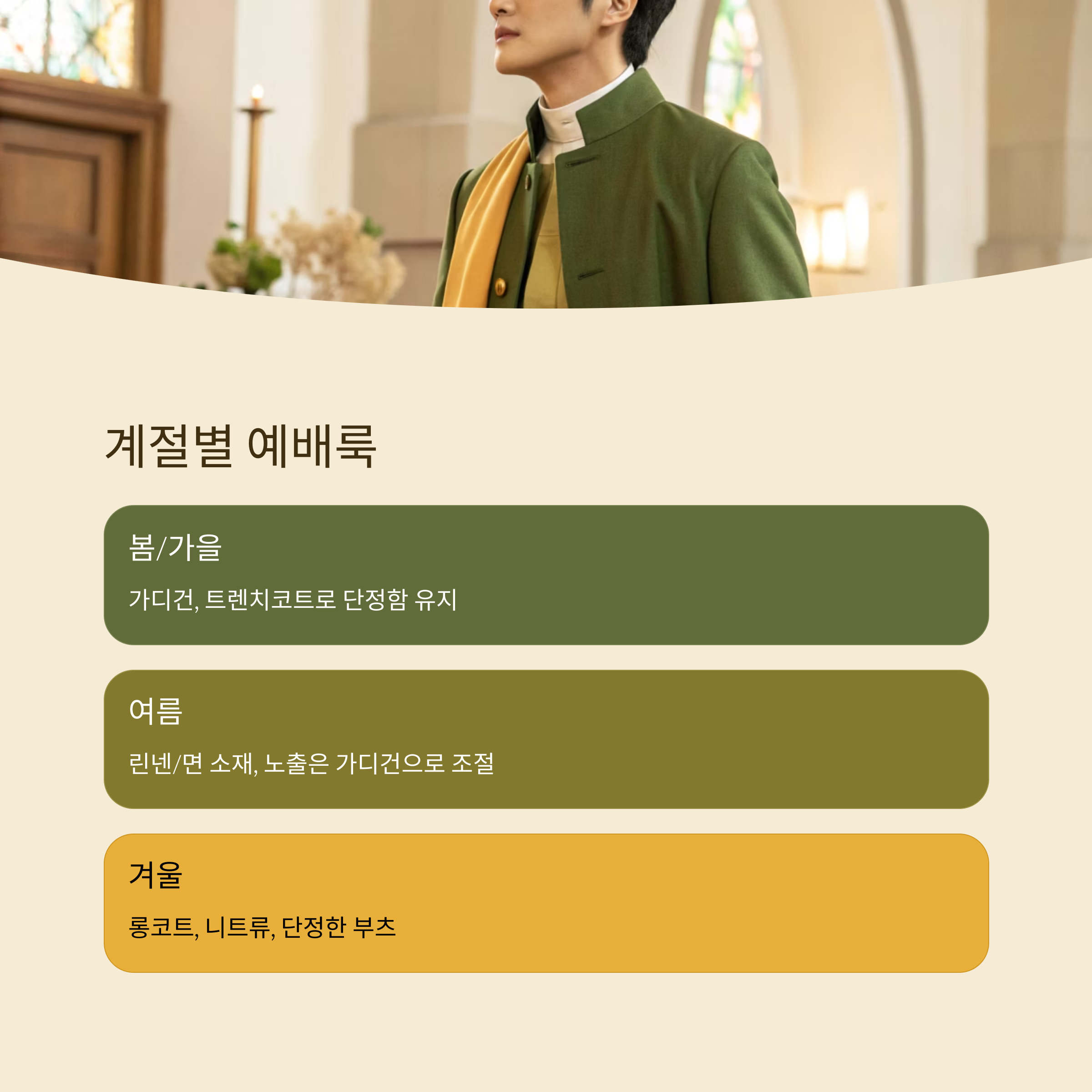계절에 따라 예배룩을 잘 조정하면 훨씬 쾌적하고 보기 좋은 예배 분위기를 만들 수 있어요. 봄과 가을에는 가디건이나 얇은 트렌치코트를 활용하면 따뜻함과 단정함을 동시에 챙길 수 있어요.