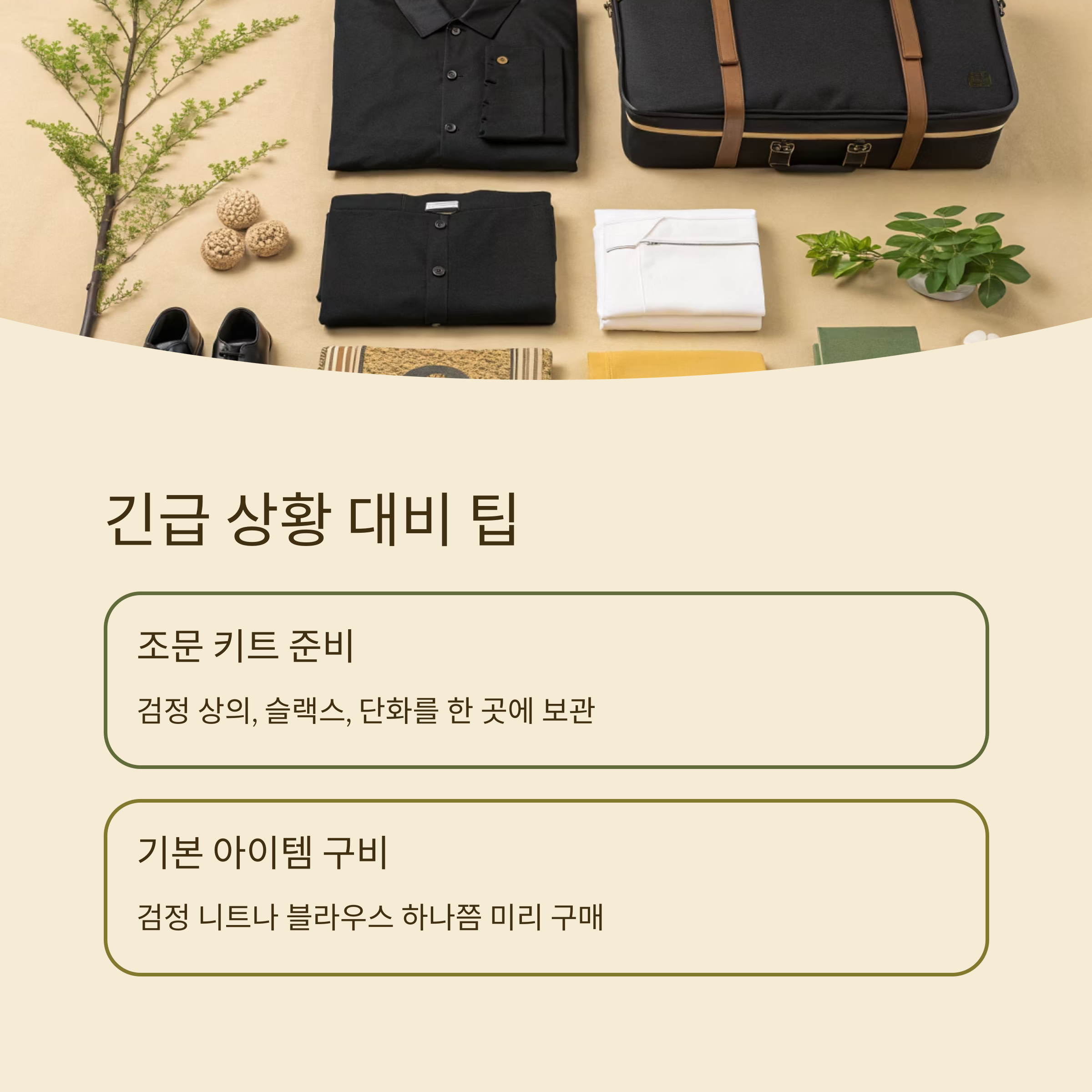 갑작스럽게 부고를 들었을 때 당황하지 않으려면, 몇 가지 꿀팁을 기억해두는 게 좋아요. 첫 번째는 '기본 조문 키트'를 준비해 두는 거예요. 검정 상의, 슬랙스, 검정 단화, 손수건, 검정 가방 정도만 상자에 모아두면 마음이 훨씬 편해져요.