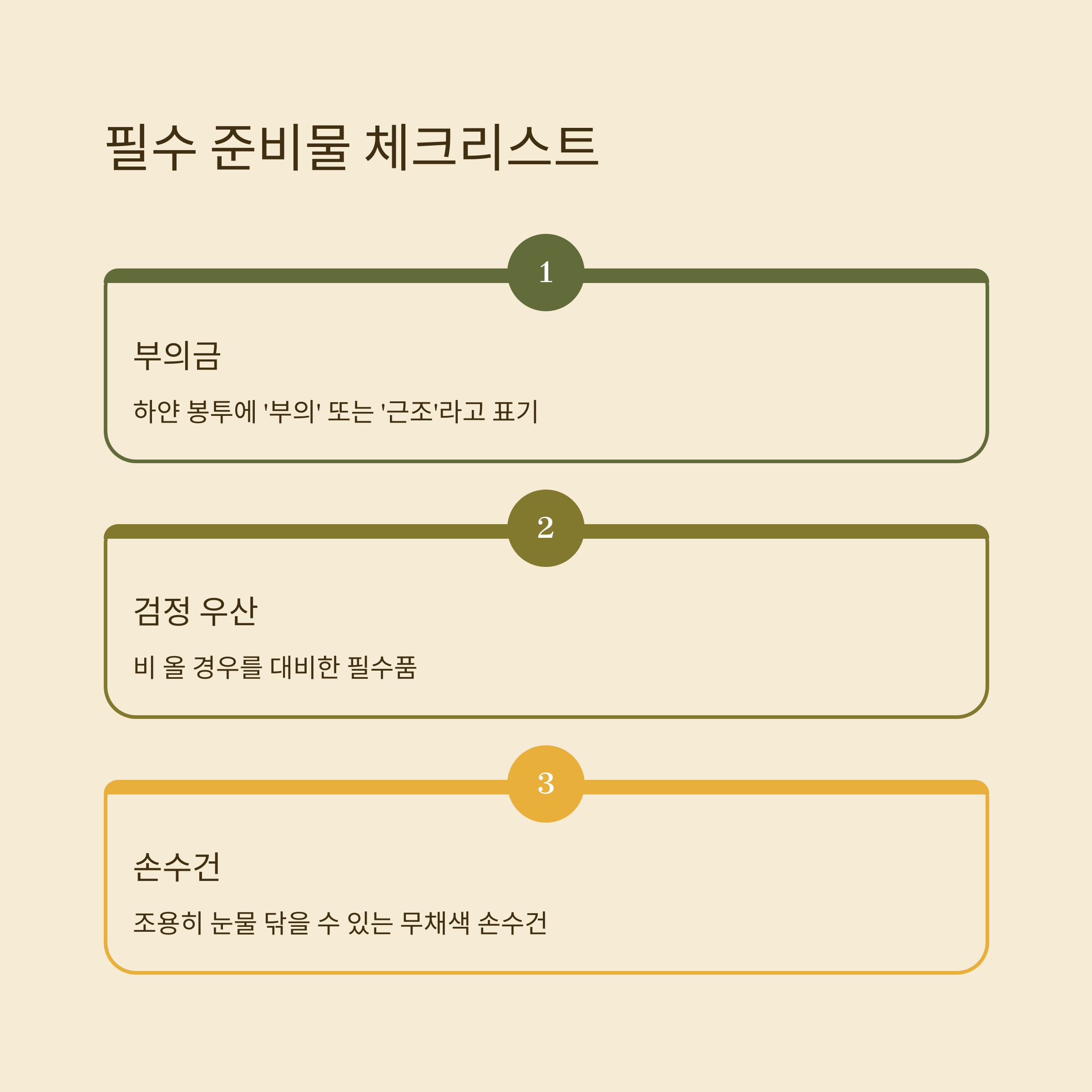 | 부의금 봉투 | 하얀 봉투, '부의' 표기 | 봉투에 캐릭터, 무늬 지양 |