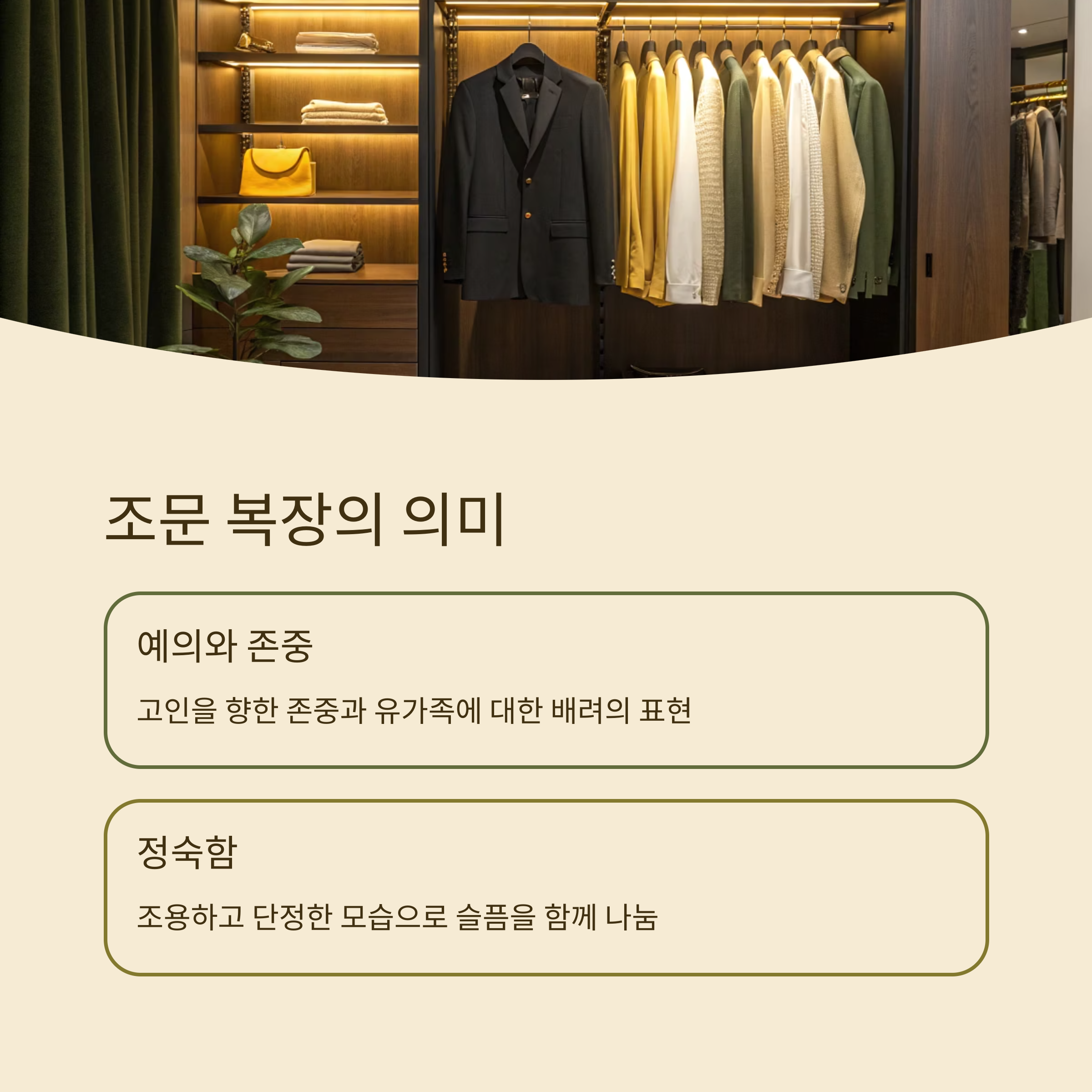 세 번째는 '마음가짐'이에요. 복장도 중요하지만 가장 중요한 건 조용한 태도와 정중한 행동이에요. 너무 화려하지 않게, 유가족과 고인의 마음을 함께하는 진심이 담긴 행동이 모든 격식을 완성해요.