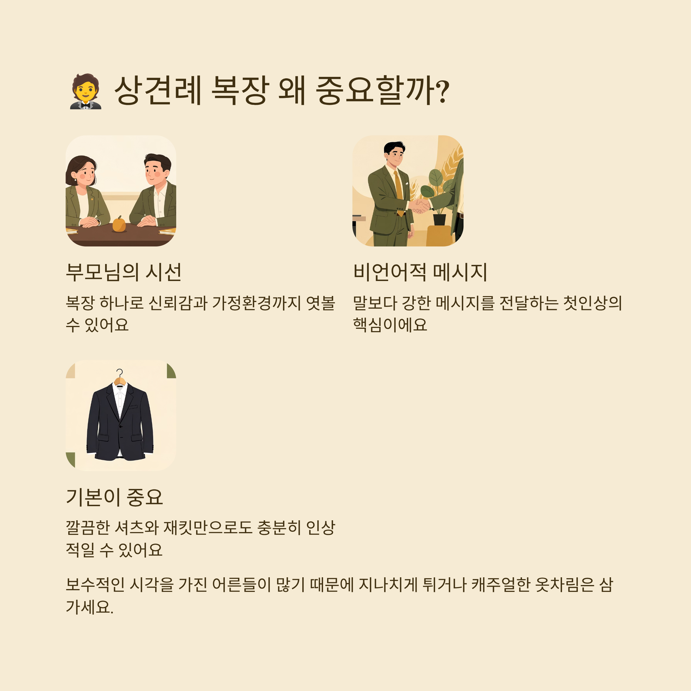 “내 아들이 어떤 집안에 시집가는가?”, “우리 딸을 책임질 사람은 어떤 사람인가?”라는 마음으로 부모님들이 참석하기 때문에, 복장 하나만으로도 긍정적 인상을 줄 수 있는 기회랍니다. 내가 생각했을 때, 복장은 말보다 강한 메시지를 전달할 수 있는 비언어적 소통의 핵심이에요.