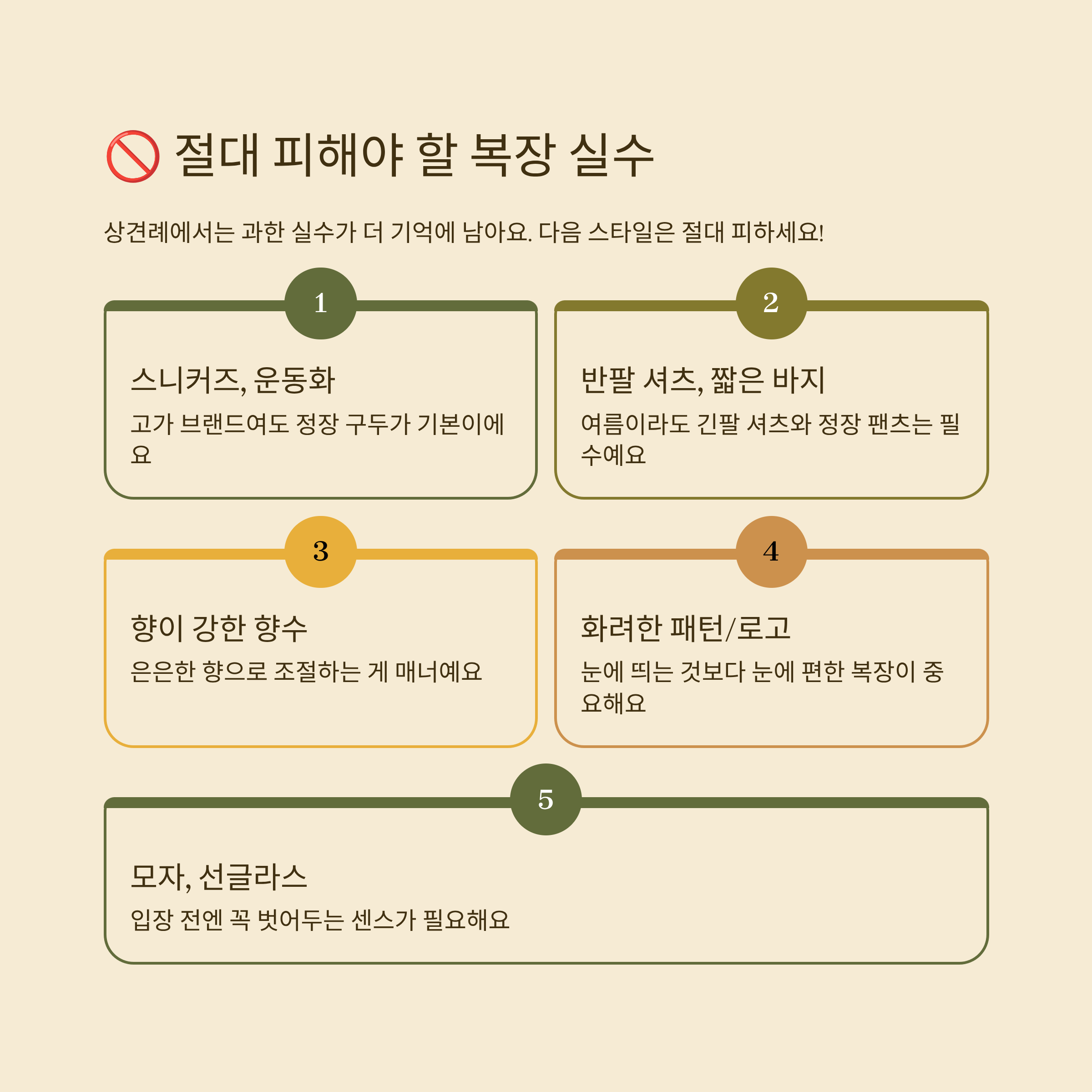 ❌ 너무 화려한 패턴/로고: 패턴 셔츠, 큰 브랜드 로고, 유행 따라가는 룩은 상견례에서 튀기만 해요. 눈에 띄는 것보다 눈에 편한 복장이 중요해요.