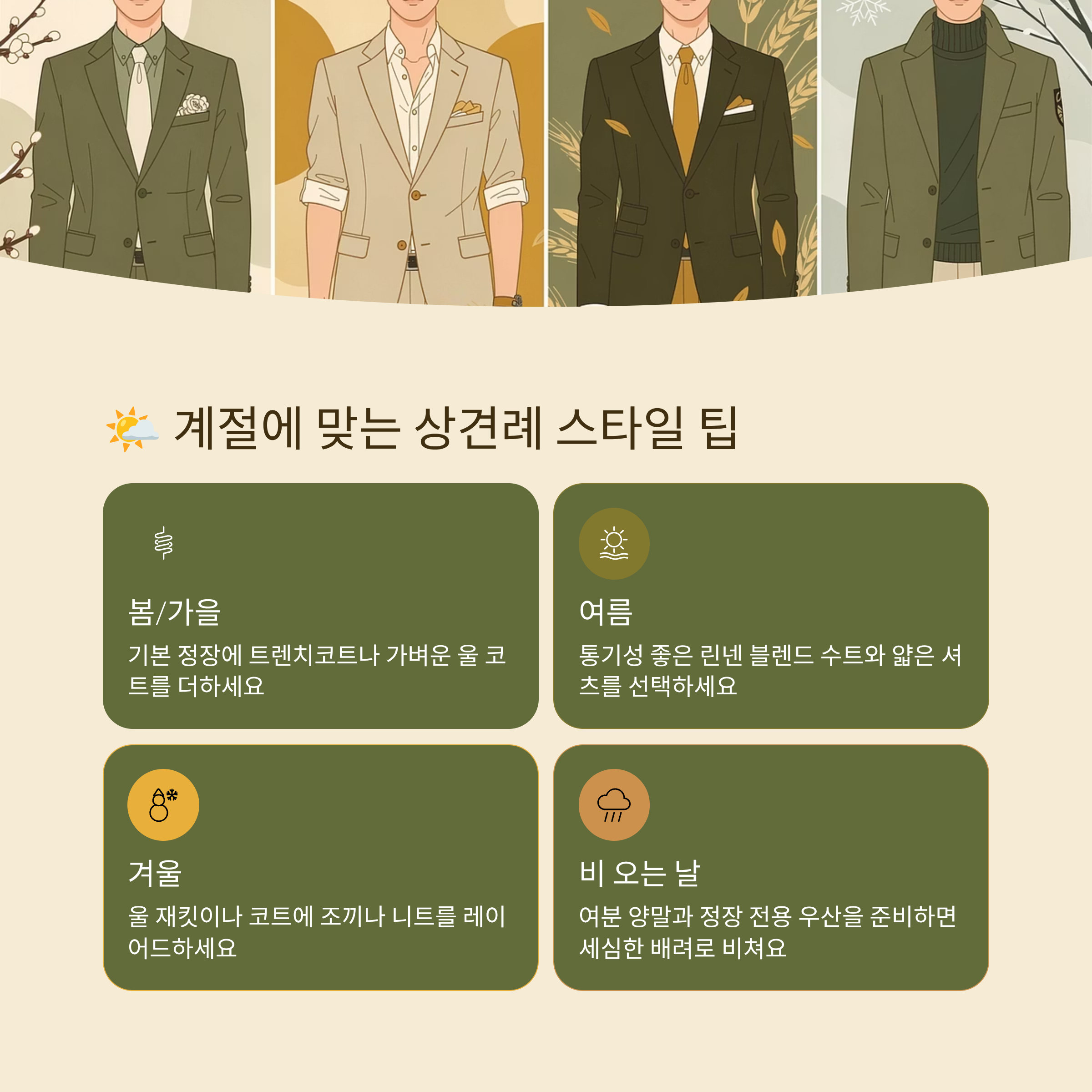 계절에 따라 상견례 복장도 다르게 접근해야 해요. 여름에 두꺼운 정장은 보기만 해도 덥고, 겨울에는 너무 얇은 복장이 무성의하게 보일 수 있거든요.