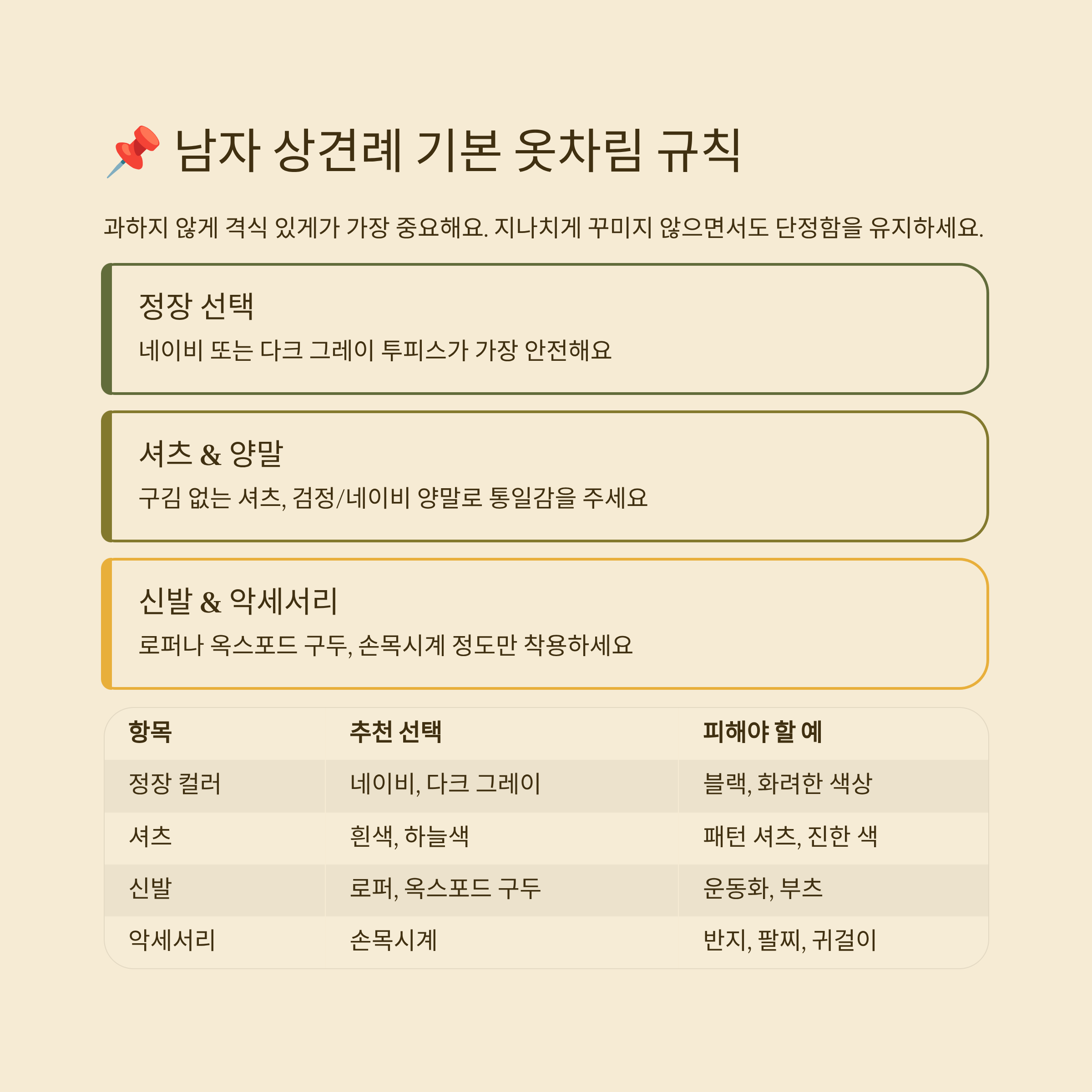 상견례 자리에서는 ‘과하지 않게 격식 있게’가 가장 중요해요. 남자 상견례 복장의 핵심은 지나치게 꾸미지 않으면서도 단정함을 유지하는 것이에요. 드레스 코드가 따로 없다면, 기본적인 정장 스타일로 준비하는 게 무난해요.