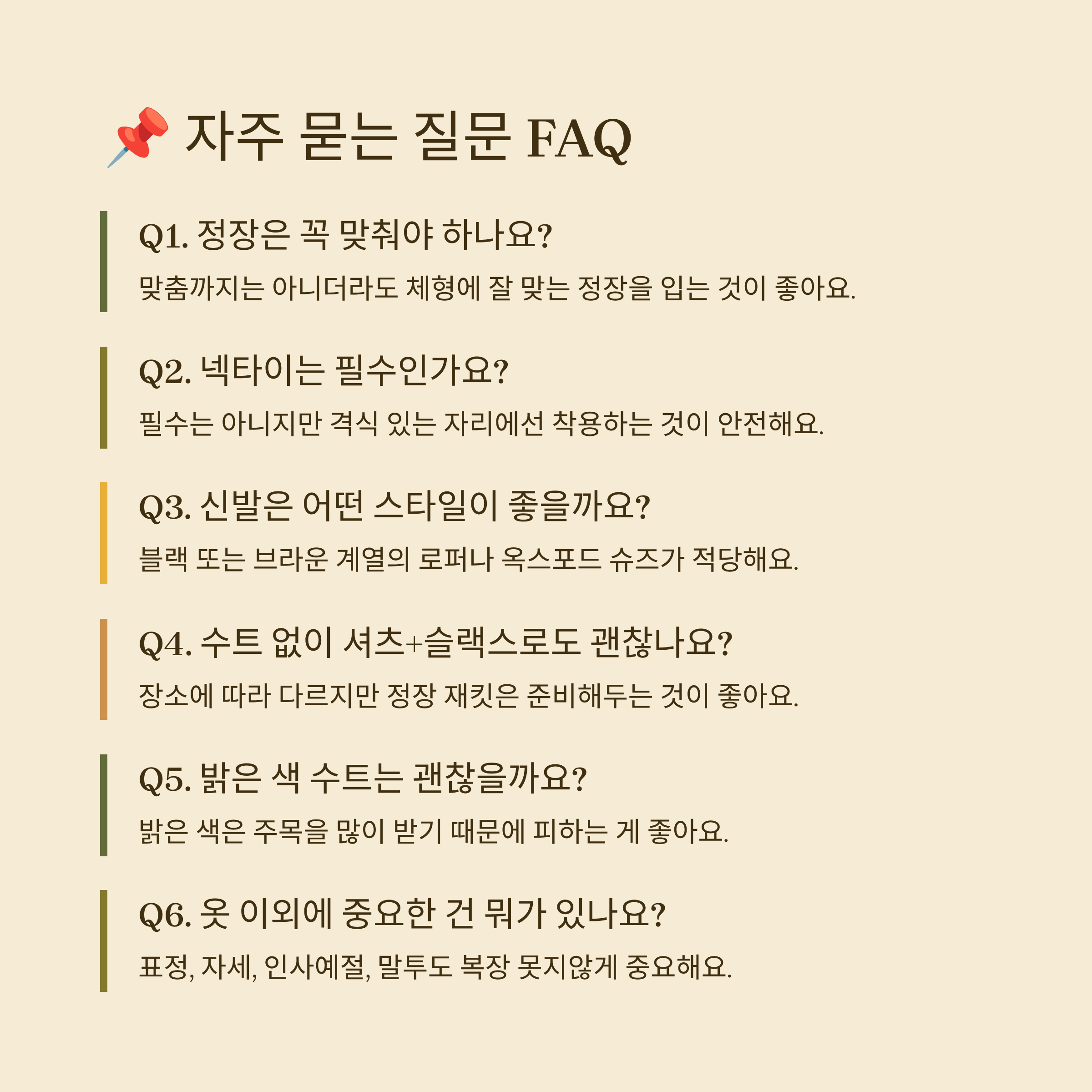 정장은 무조건 검정색일 필요는 없지만, 너무 밝거나 화려한 색은 피하는 것이 안전해요. 네이비, 차콜 그레이처럼 중후한 컬러는 무난하면서도 성숙한 인상을 줄 수 있어요.