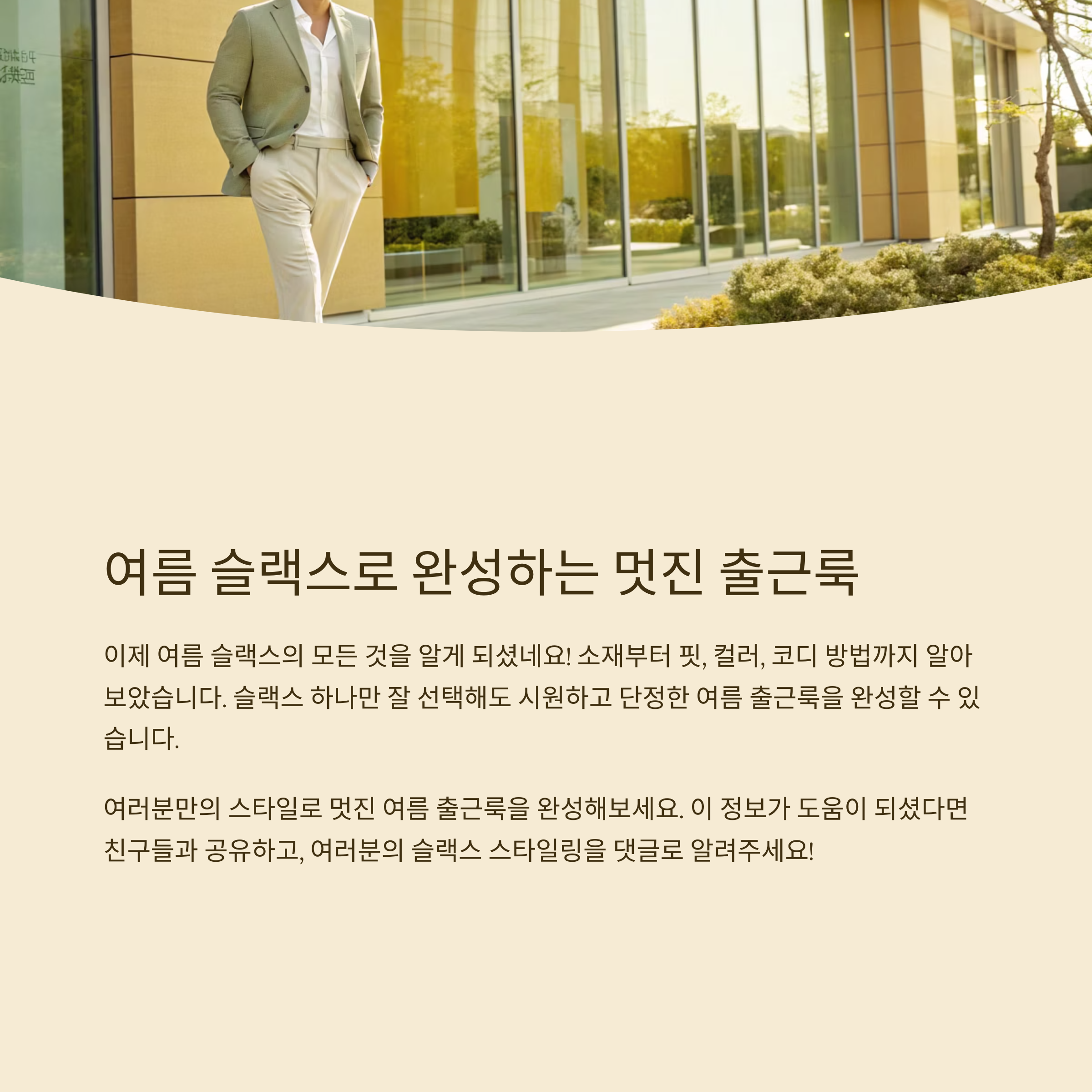 여름 출근룩에서 가장 중요한 건 시원함과 단정함의 균형이에요. 특히 남성들에게는 매일 아침 옷 고르기가 쉽지 않죠. 땀은 나는데 정장 느낌은 살아야 하고, 불쾌지수도 높지만 깔끔해 보여야 하니까요. 그럴 때 바로 ‘슬랙스’가 해답이에요! 😊