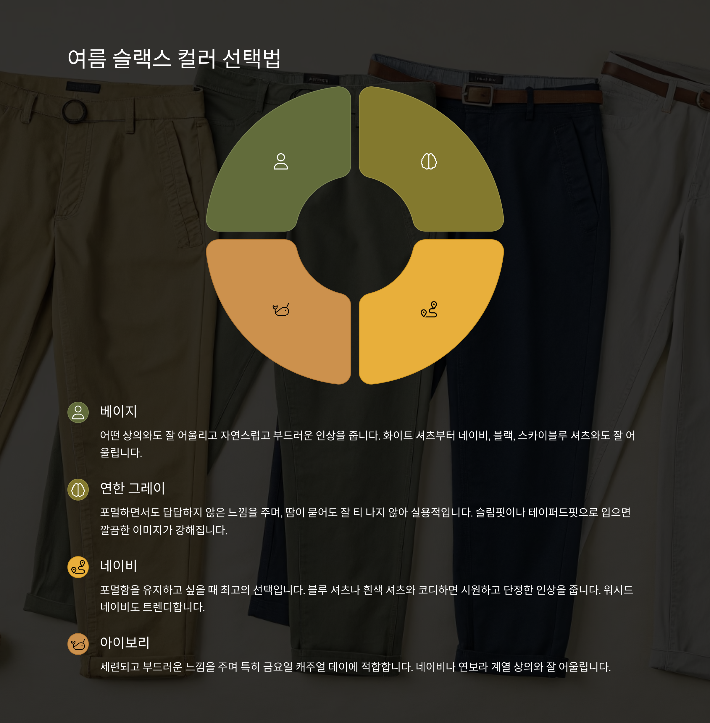 여름 슬랙스는 컬러 선택만 잘해도 스타일이 확 달라져요. 무채색 계열은 세련되고 격식 있는 느낌을 주고, 베이지나 아이보리처럼 밝은 색은 시원함과 경쾌한 인상을 더해줘요. 색조합의 센스를 살려보는 게 여름 출근룩의 포인트랍니다! 👔