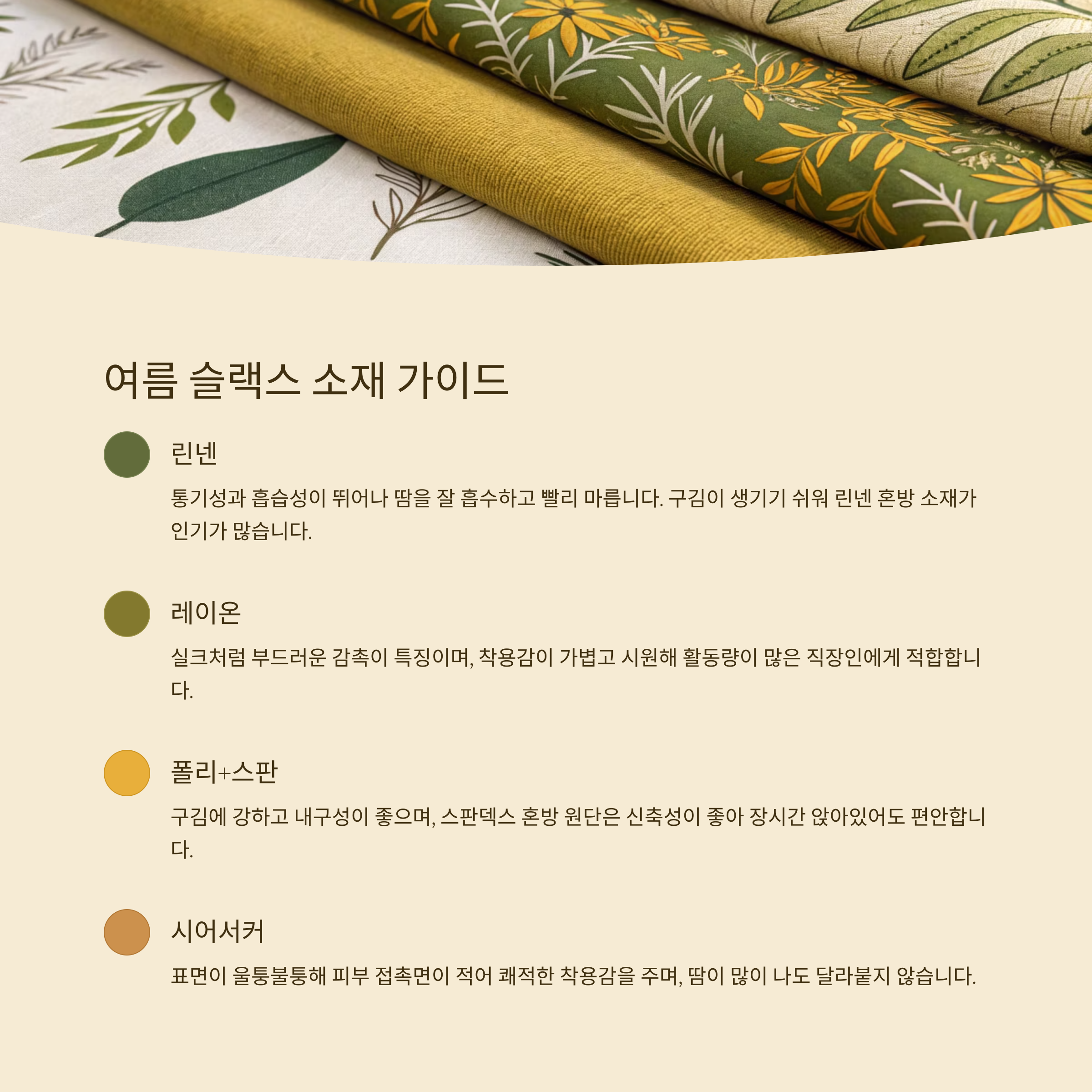 소재를 잘 선택하면 하루 종일 땀에 찌들지 않고 쾌적하게 업무를 볼 수 있어요. 특히 린넨 혼방 슬랙스는 요즘 거의 기본템처럼 여겨질 정도로 출근룩의 중심에 있어요. 무더운 여름, 시원함은 스타일 못지않게 중요하니까요. 😎