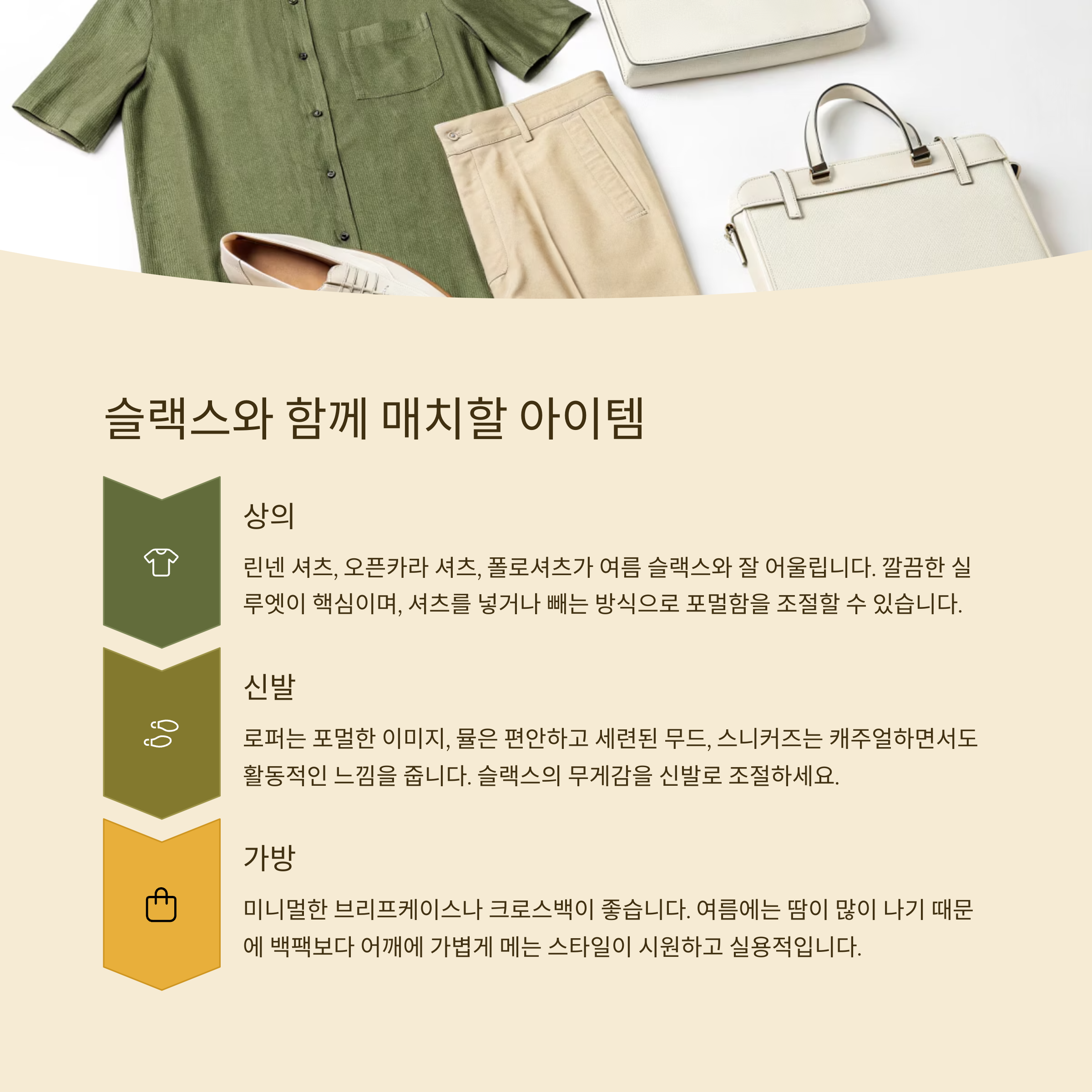 여름 슬랙스를 입을 때 상의와 신발은 물론, 액세서리나 가방까지 함께 고려하면 전체적인 완성도가 높아져요. 단정하면서도 센스 있는 인상을 남기기 위해선 디테일이 중요하답니다. 특히 출근할 때는 실용성과 격식이 모두 잡혀야 하니까요. 🎯