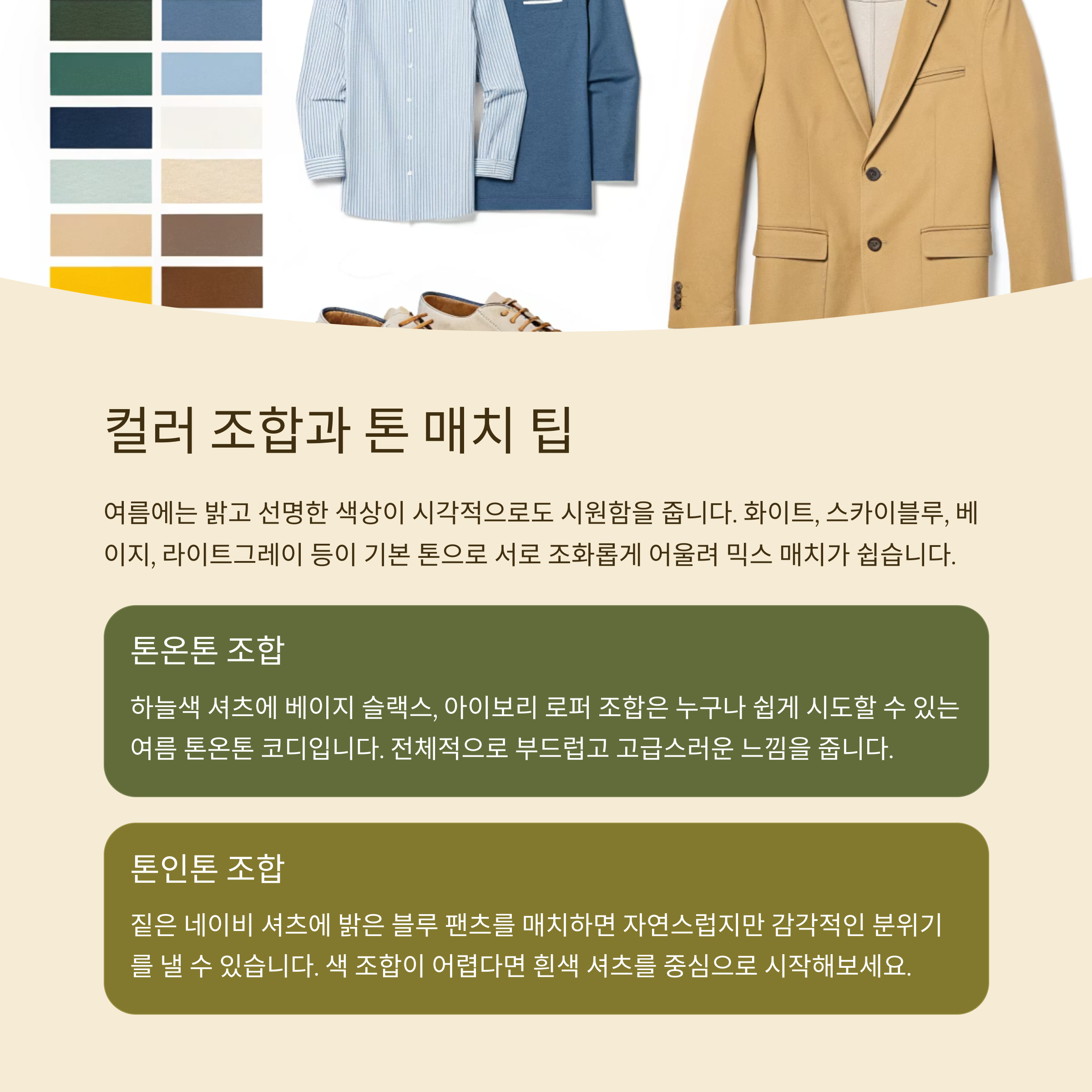 색상에서 중요한 건 '톤 조화'예요. 예를 들어, 톤온톤 조합은 전체적으로 부드럽고 고급스러운 느낌을 줄 수 있어요. 하늘색 셔츠에 베이지 슬랙스, 아이보리 로퍼 조합은 누구나 쉽게 시도할 수 있는 여름 톤온톤 코디예요.
