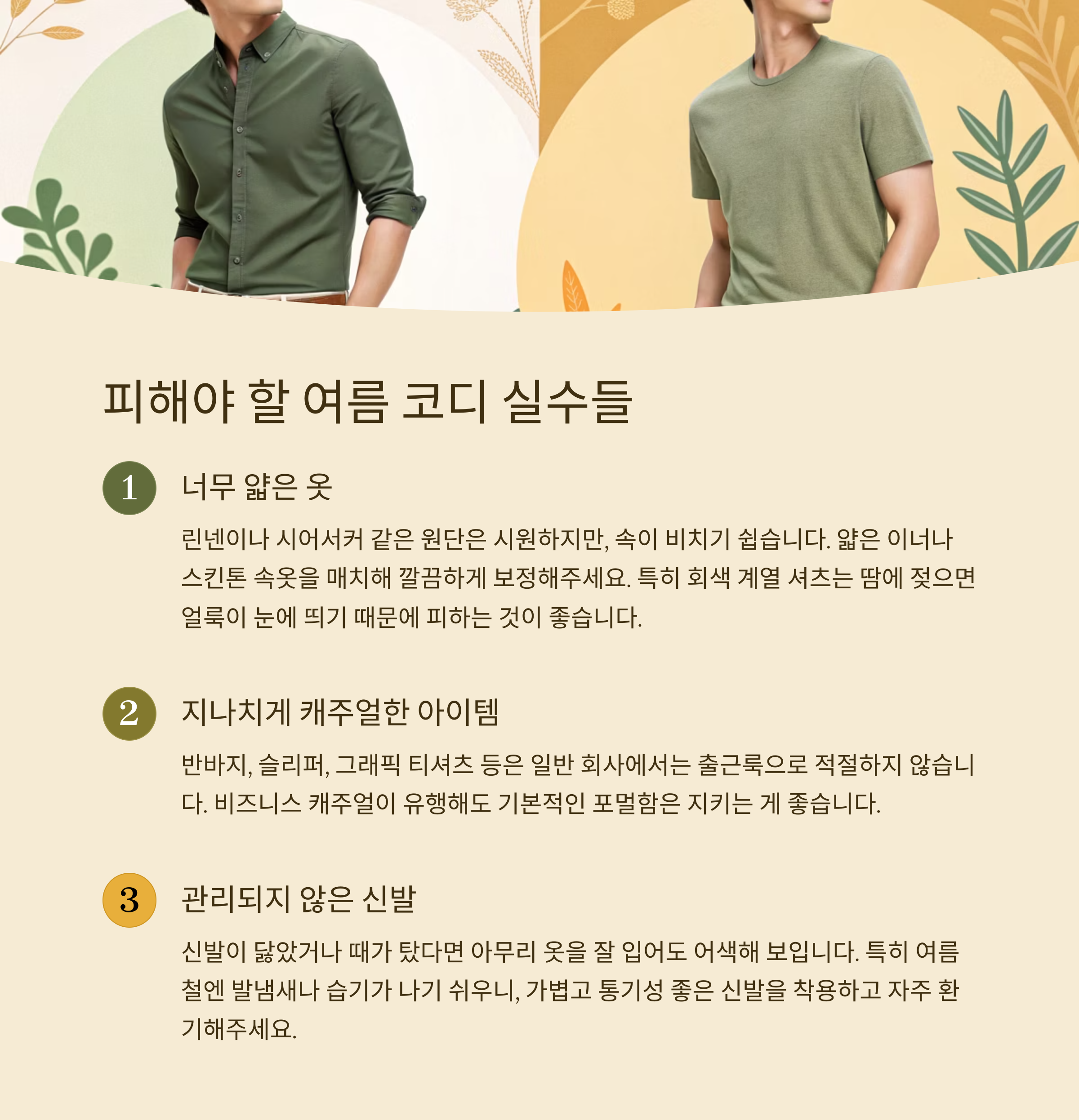 아무리 멋지게 꾸며도 몇 가지 실수 때문에 전체 인상이 흐트러질 수 있어요. 여름 출근룩에서는 ‘불쾌감’을 줄 수 있는 요소들을 반드시 피해야 해요. 특히 땀 얼룩이나 지나친 노출, 구겨진 옷은 절대 금물이에요. 기본적인 청결감이 가장 먼저 느껴져야 하거든요.