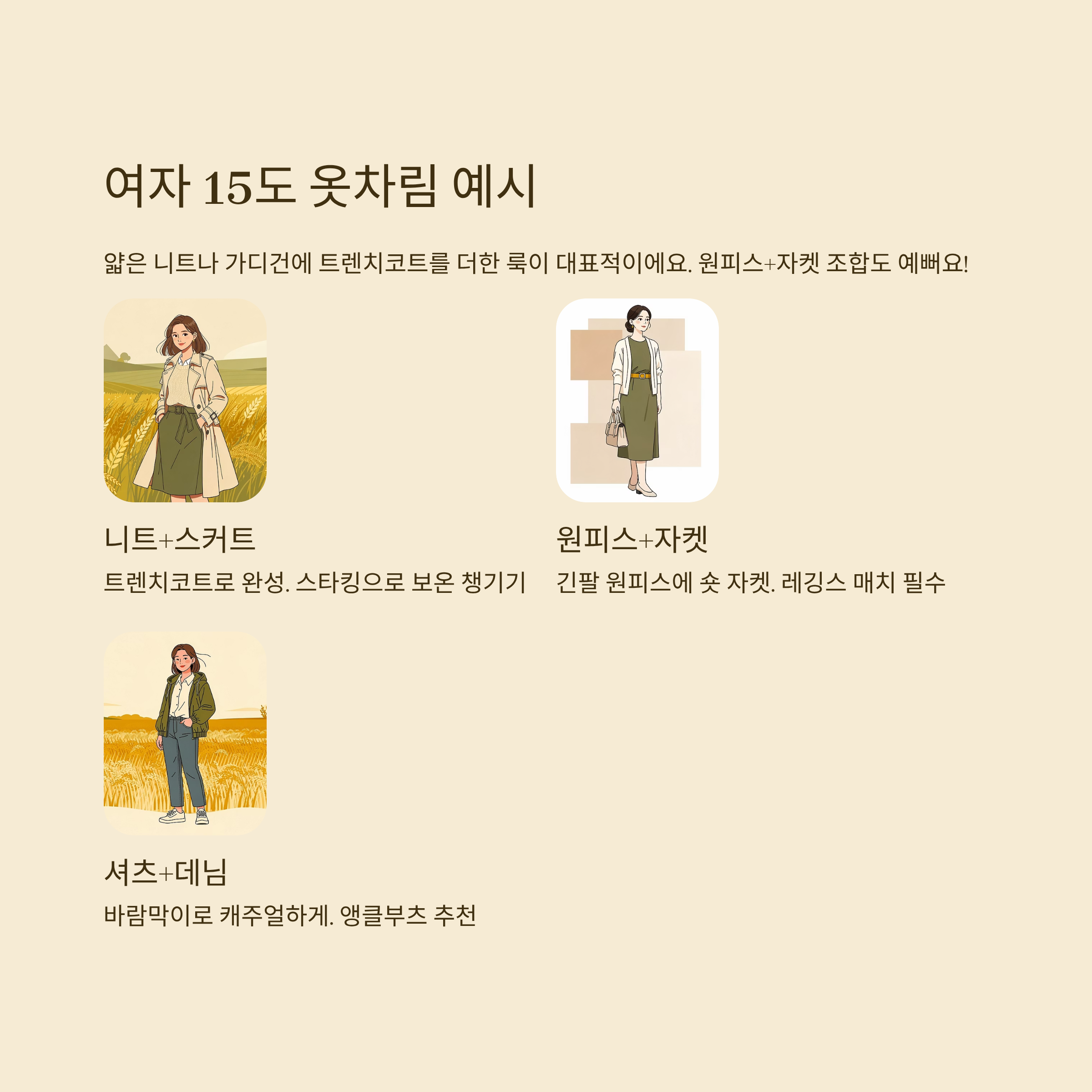 15도 날씨에 가장 많이 입는 외투는 바로 트렌치코트, 경량 패딩, 바람막이예요. 이 세 가지는 간절기에 가장 실용적인 아이템이에요. 특히 얇고 가벼워 가방에 넣고 다니기도 좋고, 어떤 룩에도 쉽게 어울린다는 장점이 있어요.