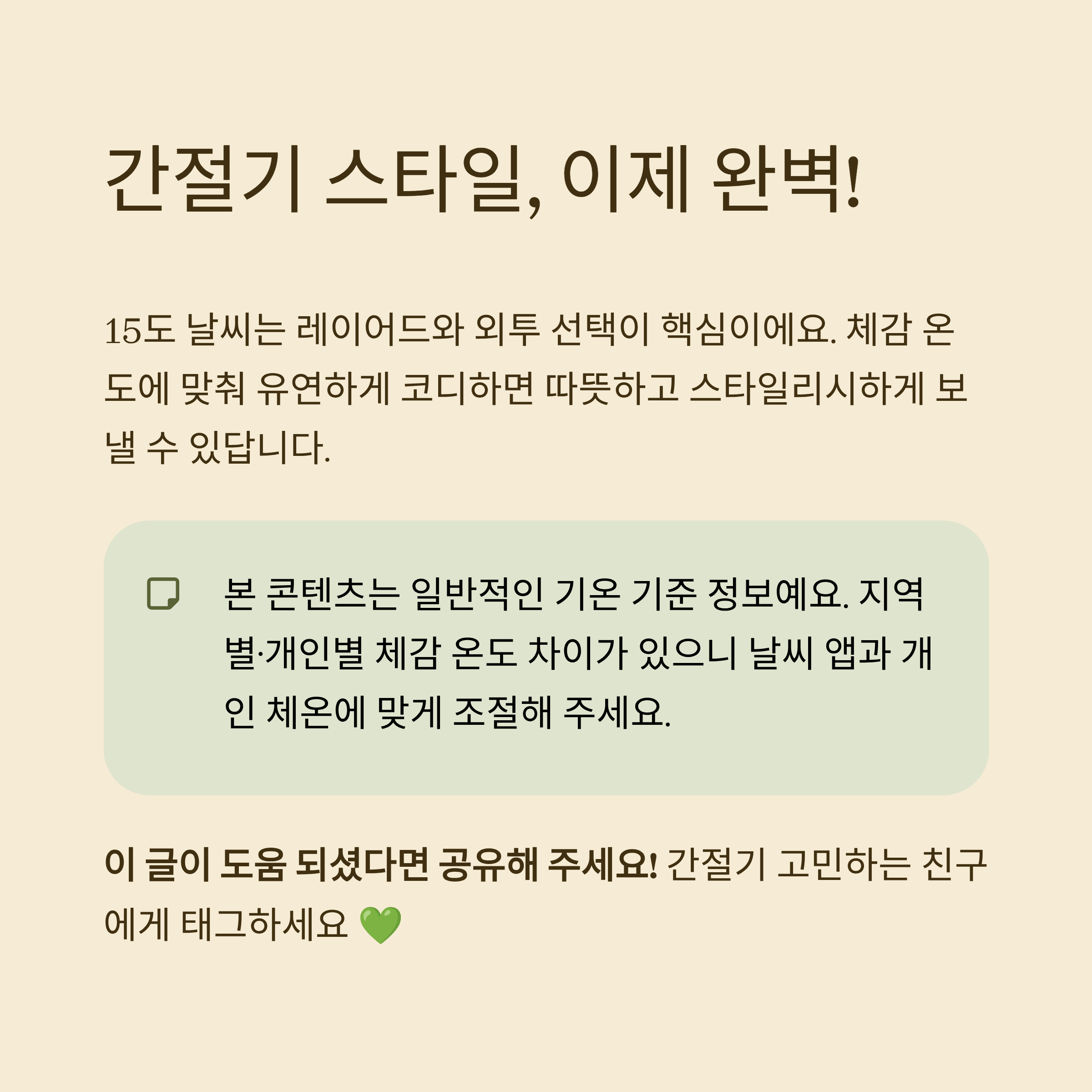 ※ 본 콘텐츠는 일반적인 기온 기준에 따라 작성된 정보로, 지역별·개인별 체감 온도 차이가 있을 수 있어요. 항상 날씨 앱과 개인 체온에 맞게 조절해 주세요.