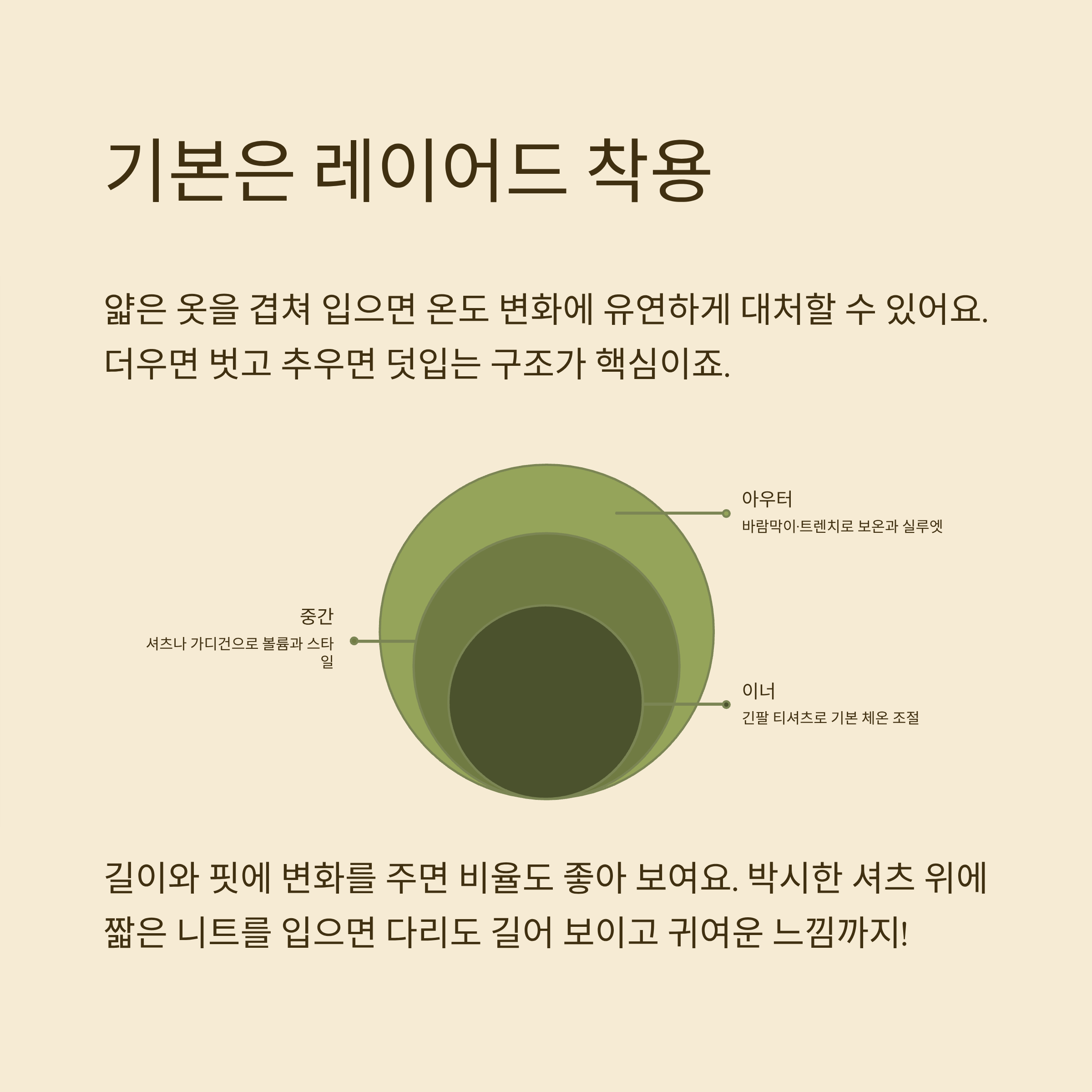 | 1층(이너) | 2층(중간) | 3층(아우터) | 추천 스타일 |