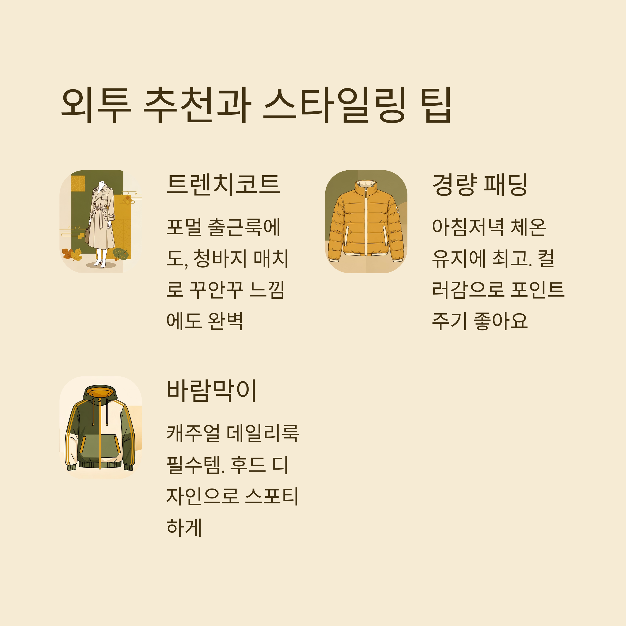외투는 단순히 추위를 막는 기능뿐 아니라 스타일의 완성도를 결정짓는 중요한 요소예요. 상황에 맞게 외투를 선택하고, 코디 전체의 톤이나 소재를 맞춰주면 훨씬 세련된 간절기룩이 완성된답니다 🎨