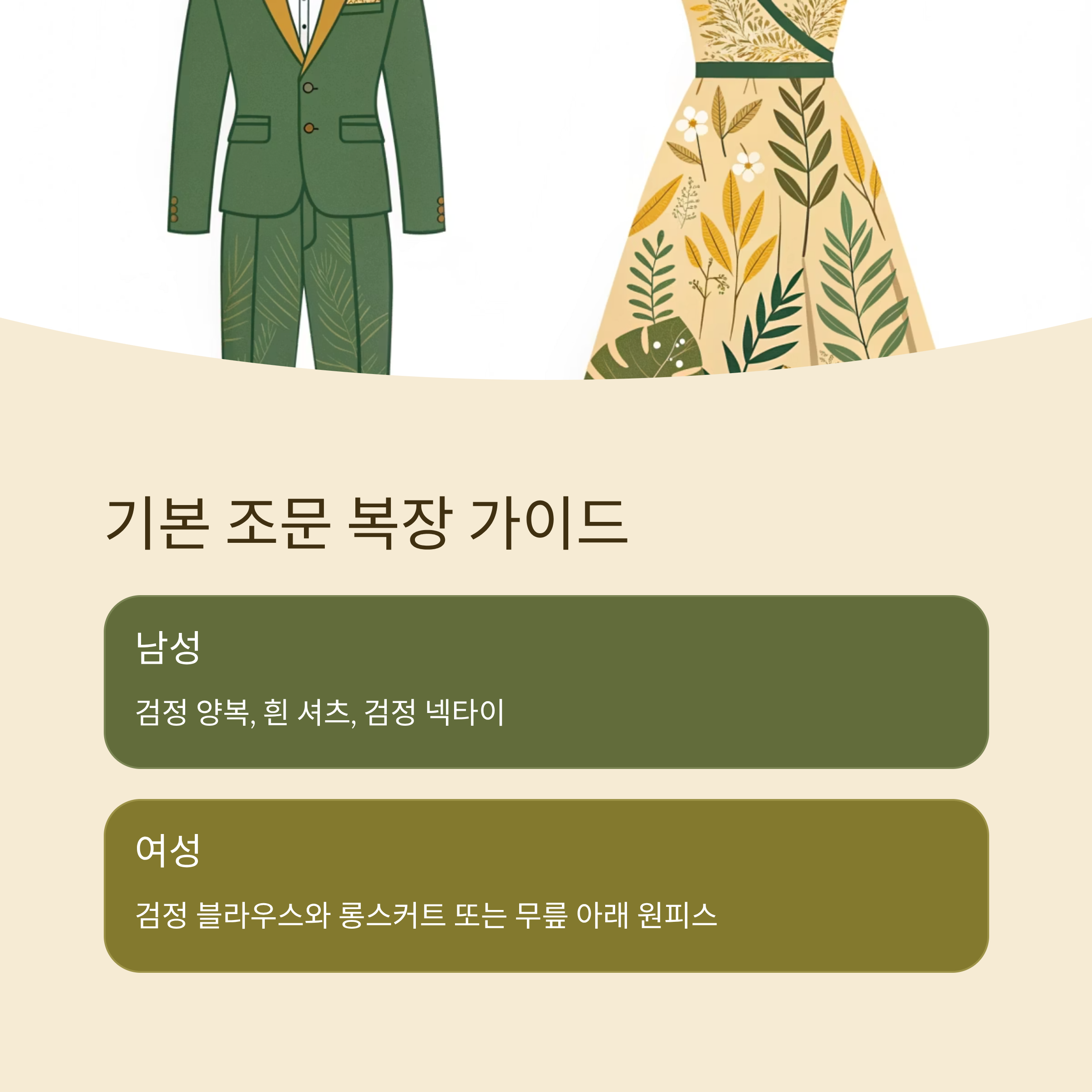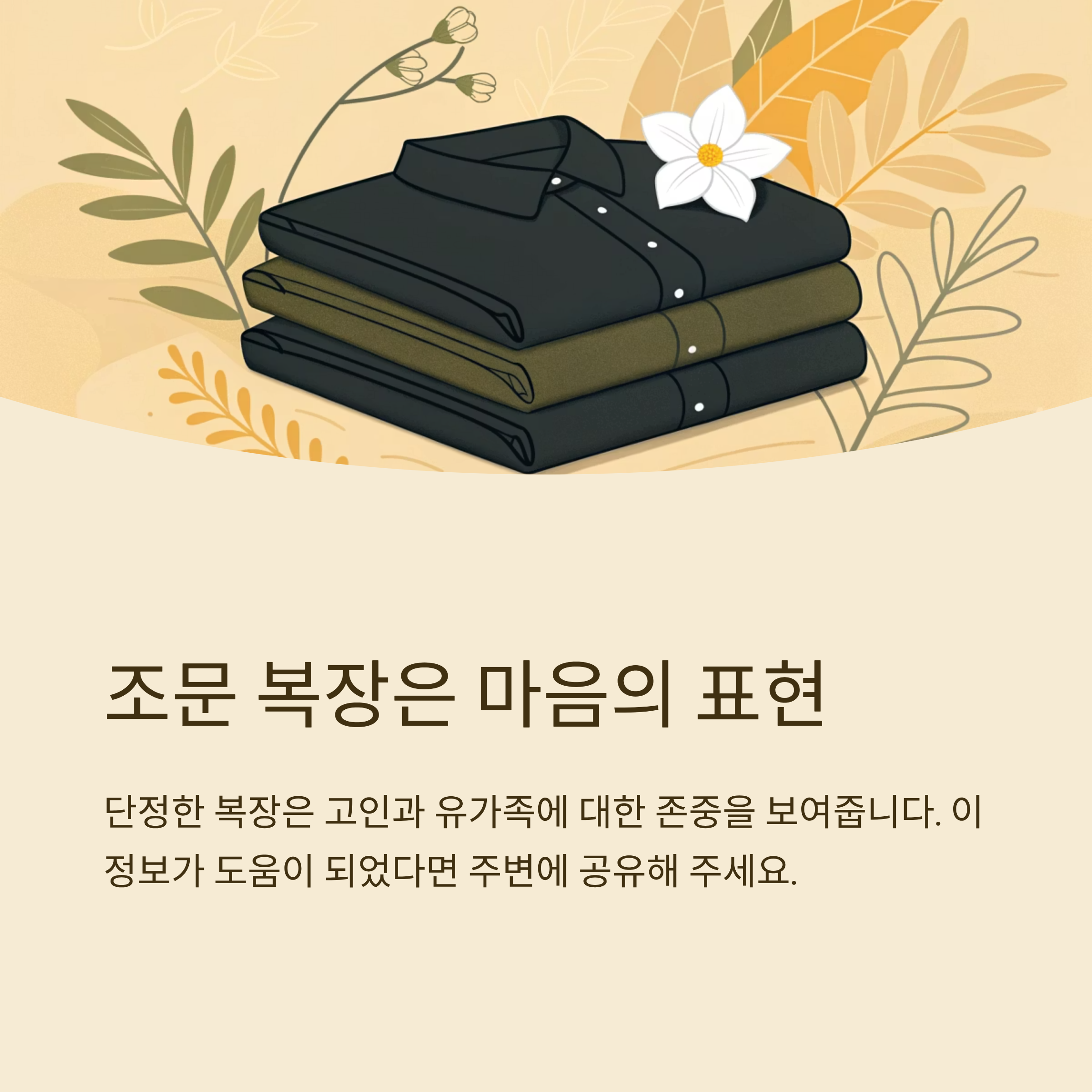 ※ 본 내용은 일반적인 조문 복장 예절과 팁을 안내한 것이며, 지역, 종교, 가정의 전통에 따라 세부 사항이 달라질 수 있어요.
