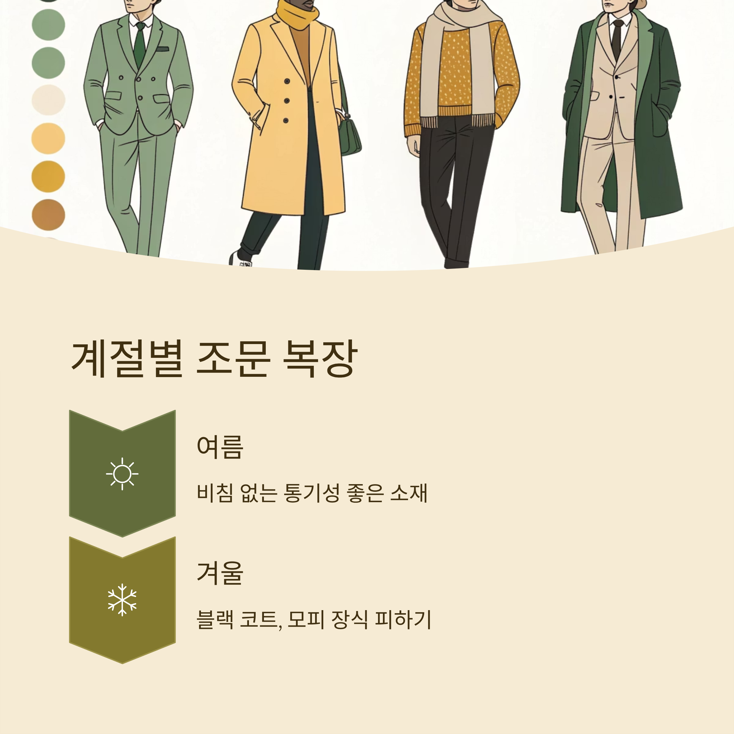 | 가을 | 트렌치코트, 블랙 슈트 | 체크무늬나 패턴 자제 |