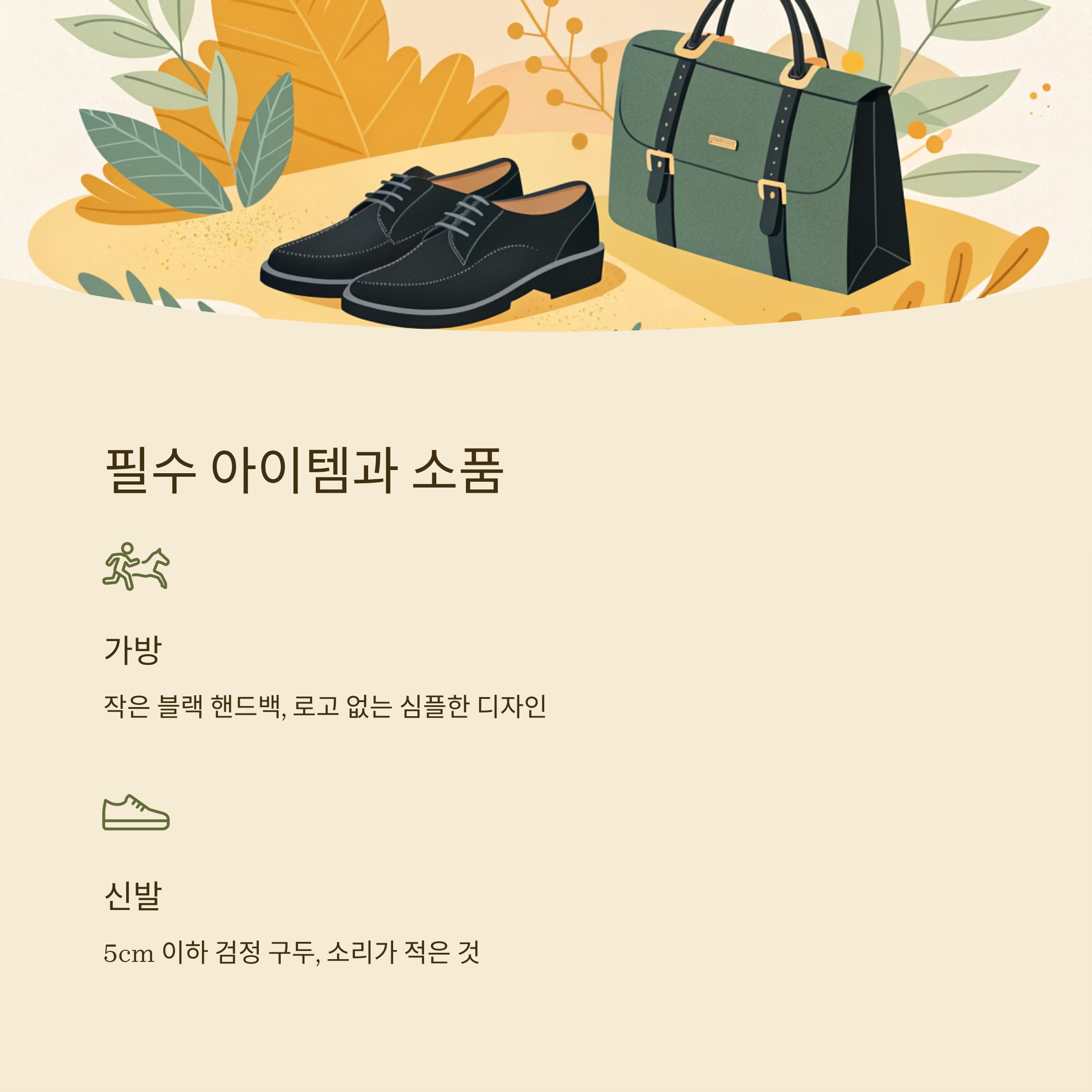 신발은 굽이 너무 높지 않은 검정 구두나 플랫슈즈가 안전합니다. 여성의 경우 5cm 이하 굽을 권장하며, 남성은 광이 심하지 않은 구두를 신는 게 좋아요. 걸을 때 소리가 큰 구두도 피하는 것이 좋습니다.