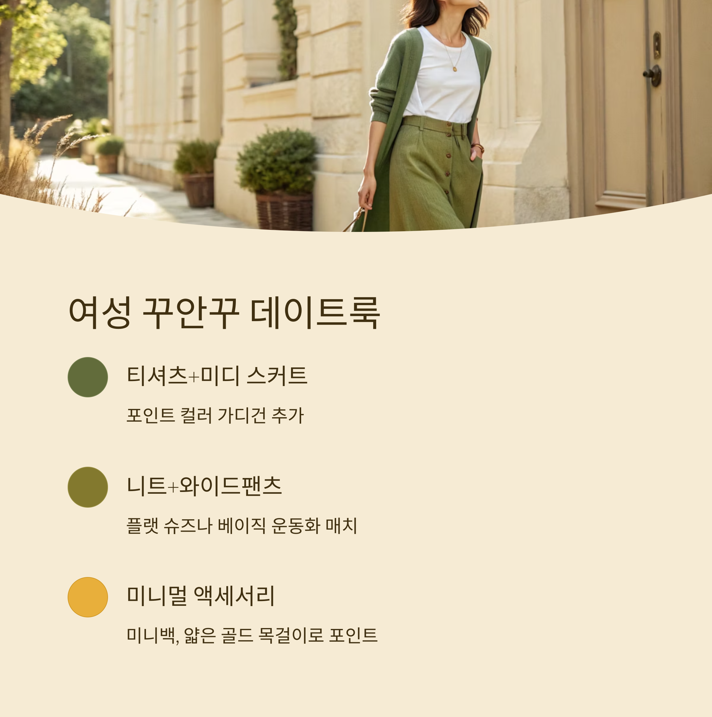 여자 꾸안꾸 데이트룩의 핵심은 '꾸민 듯, 너무 꾸미지 않음'이에요. 부담스러운 원피스 대신 티셔츠와 스커트 조합, 혹은 니트+와이드팬츠 같은 믹스매치가 인기예요.