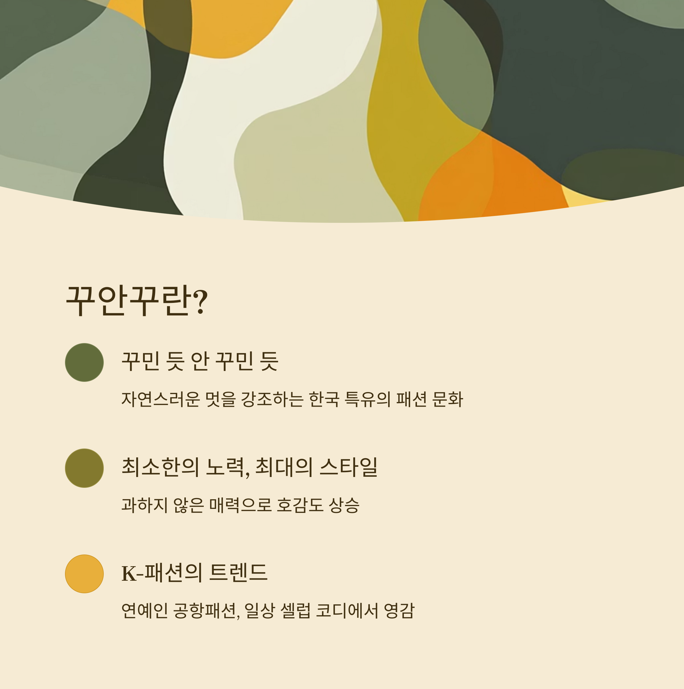 ‘꾸안꾸’는 ‘꾸민 듯 안 꾸민 듯’의 줄임말로, 자연스러운 멋을 강조하는 한국 특유의 패션 문화에서 시작됐어요. 이는 K-패션의 트렌디한 감성과도 연결되며, 연예인 공항 패션이나 일상 셀럽 코디에서 자주 볼 수 있었죠.