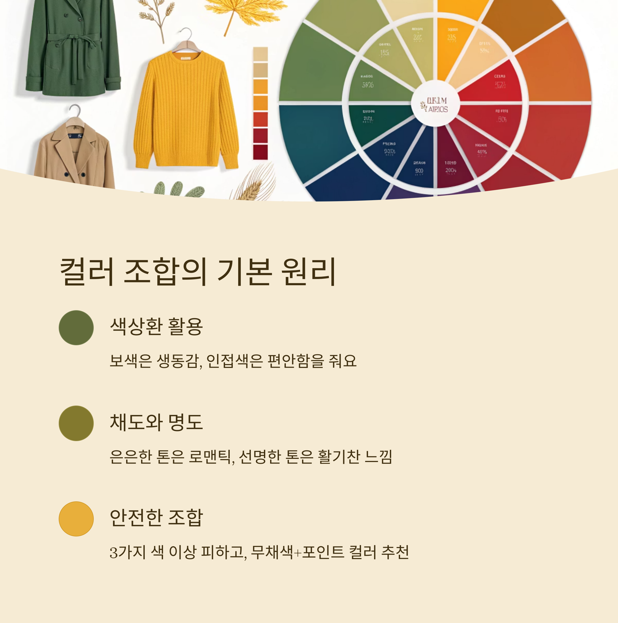 컬러 조합의 핵심은 ‘조화’예요. 아무리 예쁜 색이라도 서로 어울리지 않으면 전체적인 룩이 어색해 보일 수 있어요. 가장 기본적인 원리는 바로 ‘색상환(color wheel)’이에요. 색상환에서 마주보는 색은 대비가 강해 생동감을 주고, 인접한 색은 부드럽고 편안한 느낌을 준답니다.
