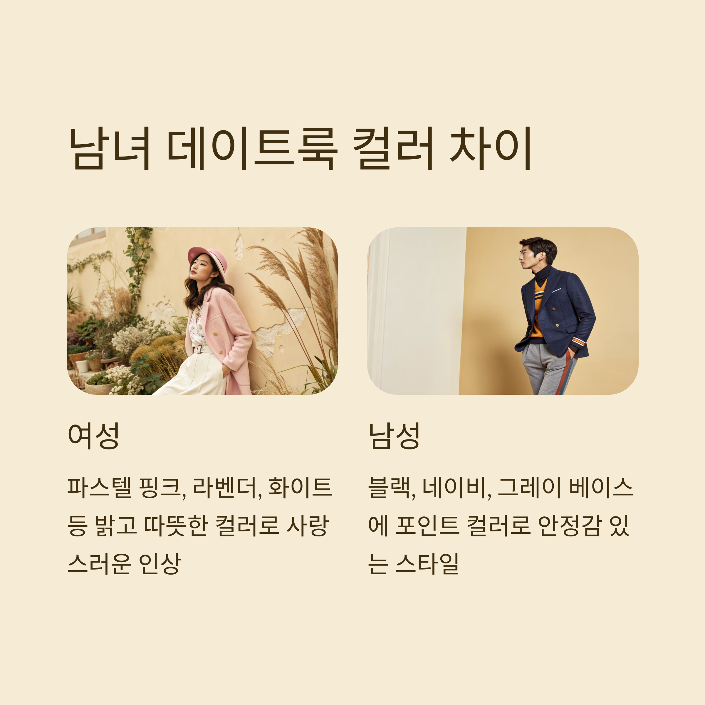 | 베이지 + 브라운 | 부드럽고 따뜻함 | 카페 데이트 |