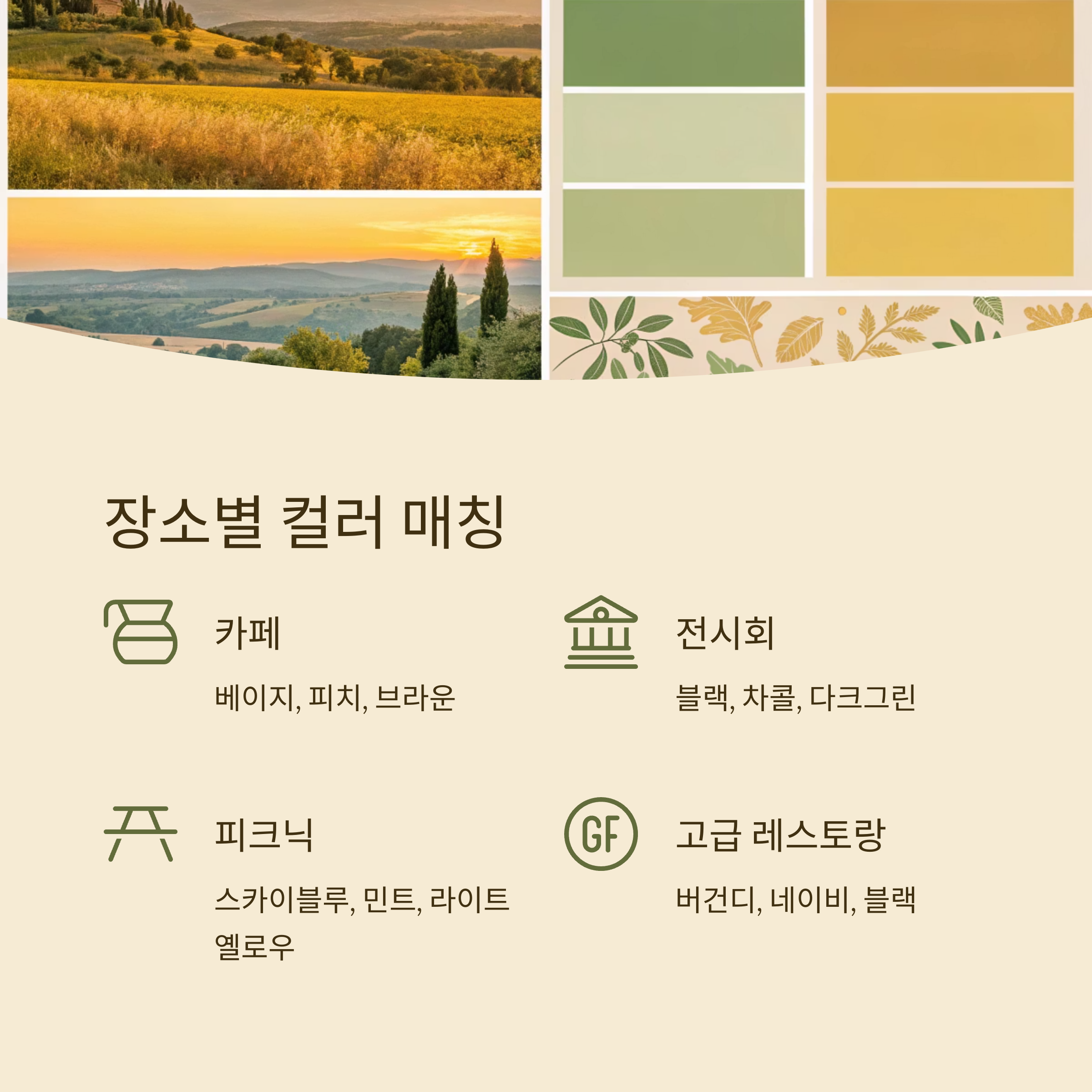| 카페 | 베이지, 피치, 브라운 | 포근하고 따뜻함 |