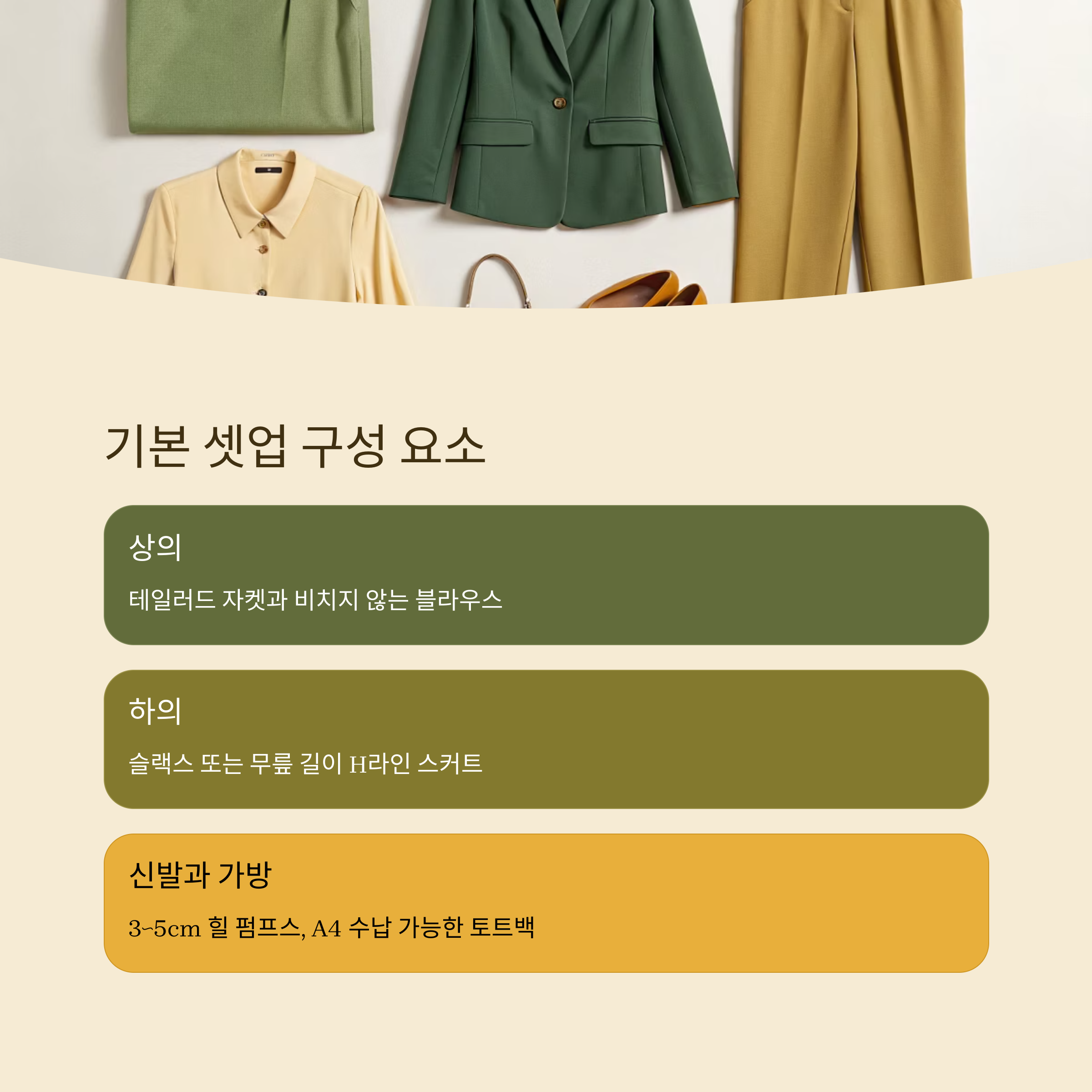 | 신발 | 3~5cm 힐 펌프스 | 굽 높은 하이힐, 스니커즈 | 발 관리도 중요해요 |