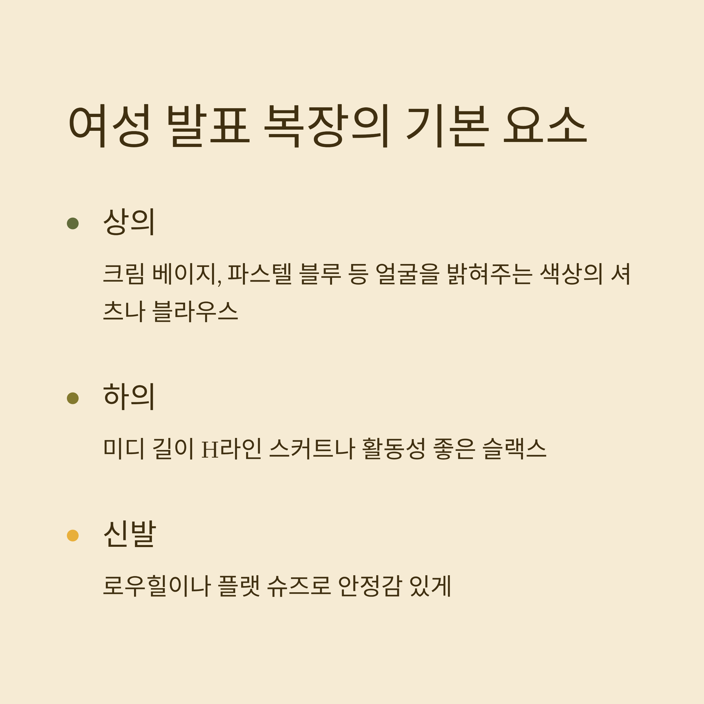 여성 발표복장은 크게 5가지 요소로 나눌 수 있어요. 상의, 하의, 신발, 헤어스타일, 그리고 액세서리예요. 발표라는 특수한 상황에서는 개성보다는 ‘신뢰도’와 ‘안정감’을 우선순위에 두는 게 좋아요.
