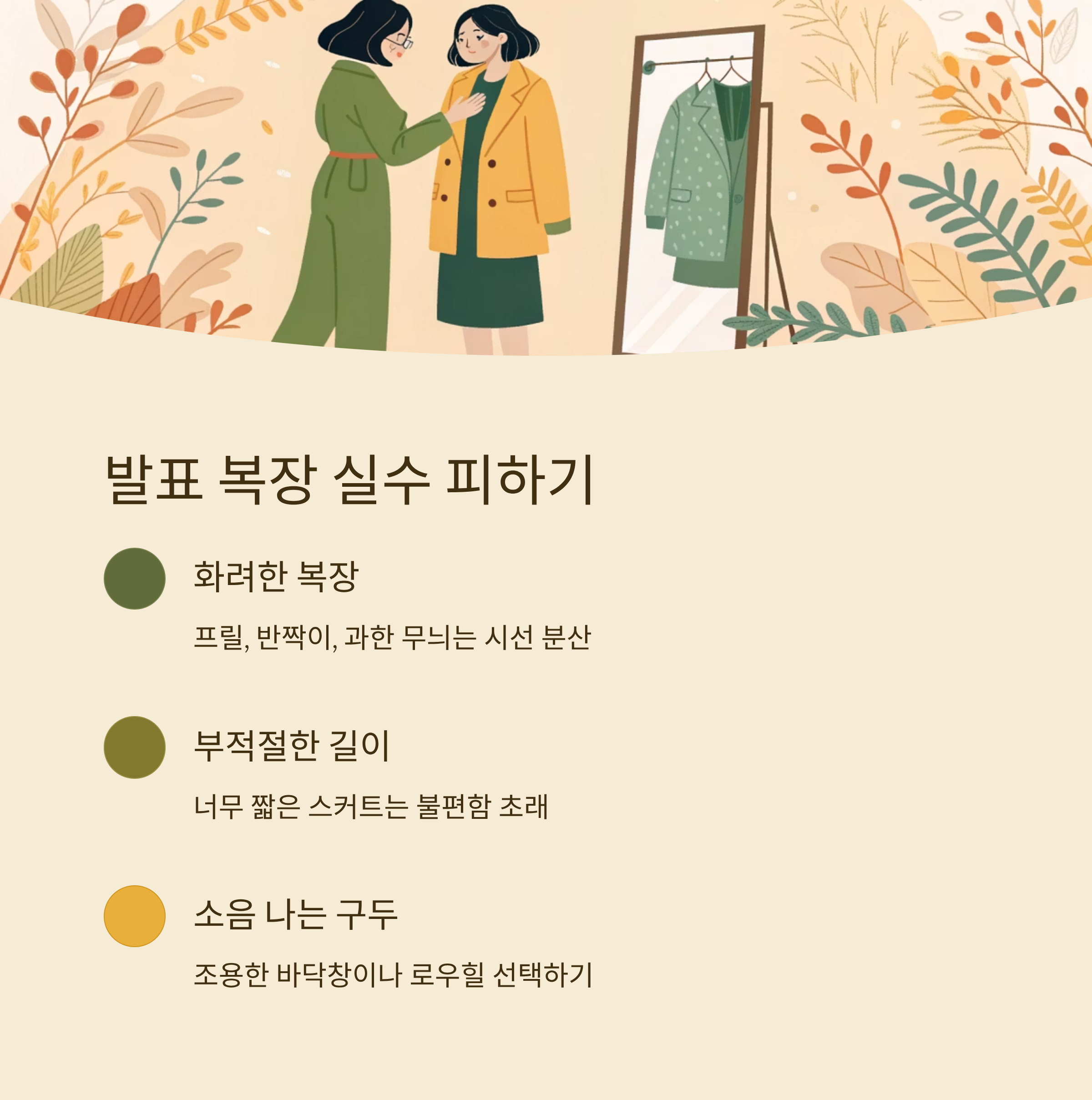 ※ 본 글은 일반적인 발표 복장 정보를 제공하며, 개인의 발표 주제, 장소, 분위기에 따라 적절히 변형하여 적용하는 것이 좋습니다.