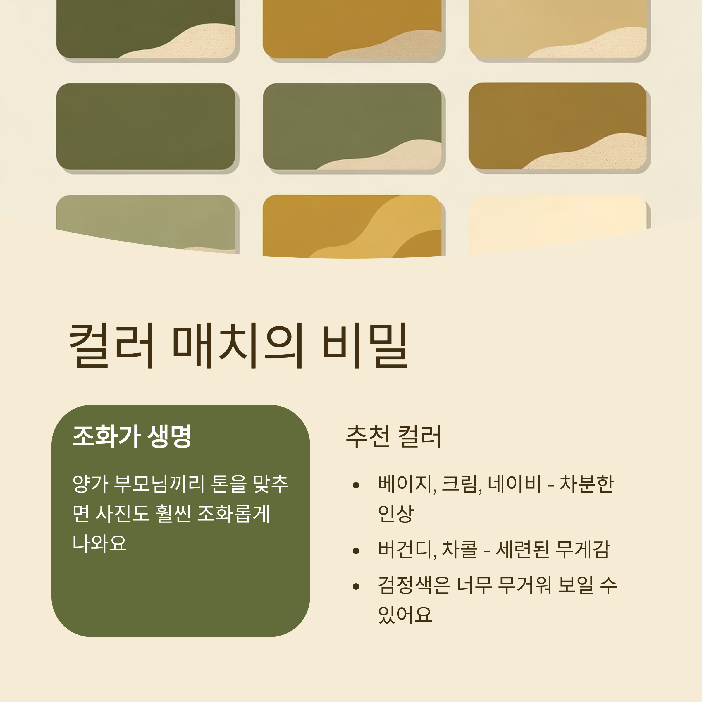 중요한 건 양가 부모님끼리 톤을 어느 정도 맞추는 것이에요. 사전에 ‘우리는 베이지 톤 중심으로 갈게요~’라고 알려드리면 오해도 없고 사진 찍을 때도 훨씬 조화롭게 나와요. 괜히 따로 놀면 분위기가 엉성해질 수 있거든요.