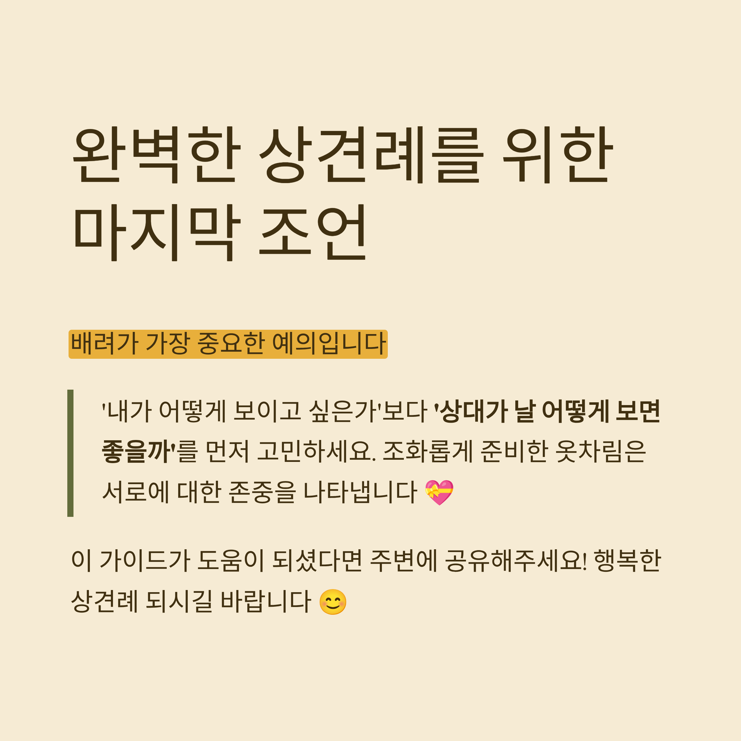 결국 실수는 '나만 생각했을 때' 발생해요. 상견례는 상대의 기분을 먼저 배려하는 자리니까요. ‘내가 어떻게 보이고 싶은가’보다 ‘상대가 날 어떻게 보면 좋을까’를 먼저 고민하면 정답이 보여요 😊