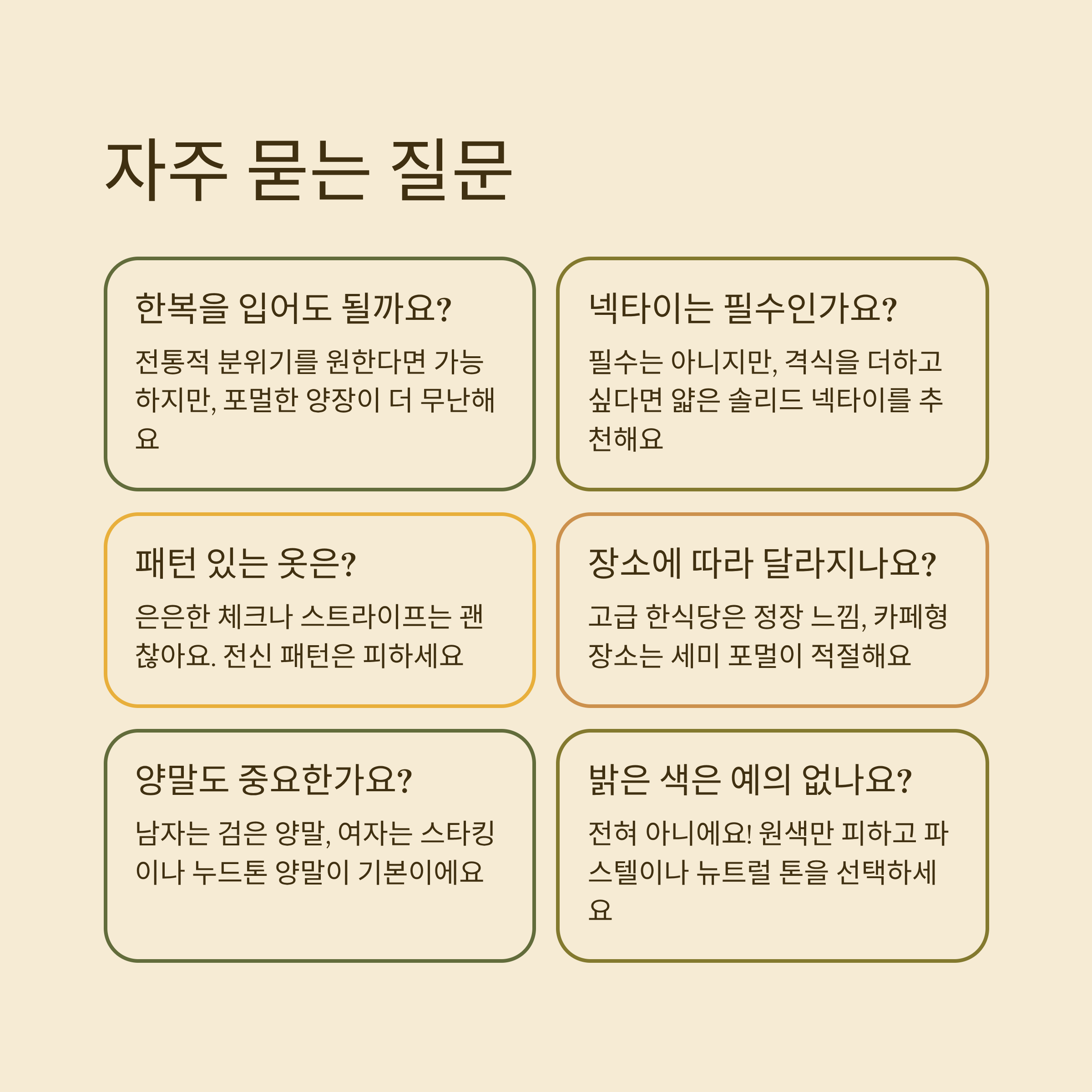 A2. 전통적인 분위기를 원한다면 가능하지만, 일반적으로는 포멀한 양장 스타일이 더 무난해요.