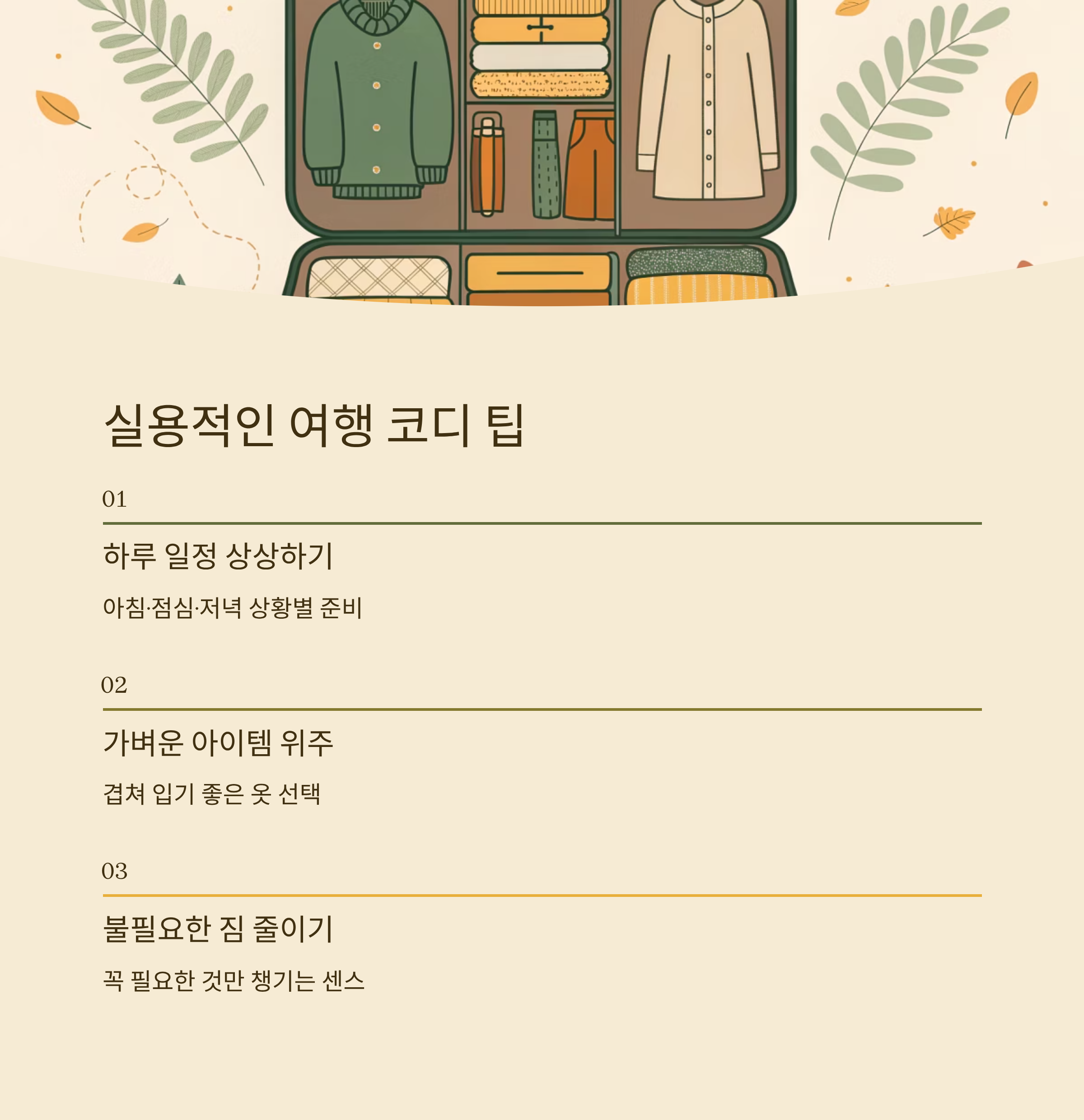 하루 일정을 기준으로 아침·점심·저녁 상황을 상상하며 옷을 준비해보면 실수가 줄어요. 가볍고 겹쳐 입기 좋은 아이템 위주로 챙기는 것이 핵심이에요. 불필요한 짐을 줄이고 꼭 필요한 것만 챙기는 센스가 필요해요.
