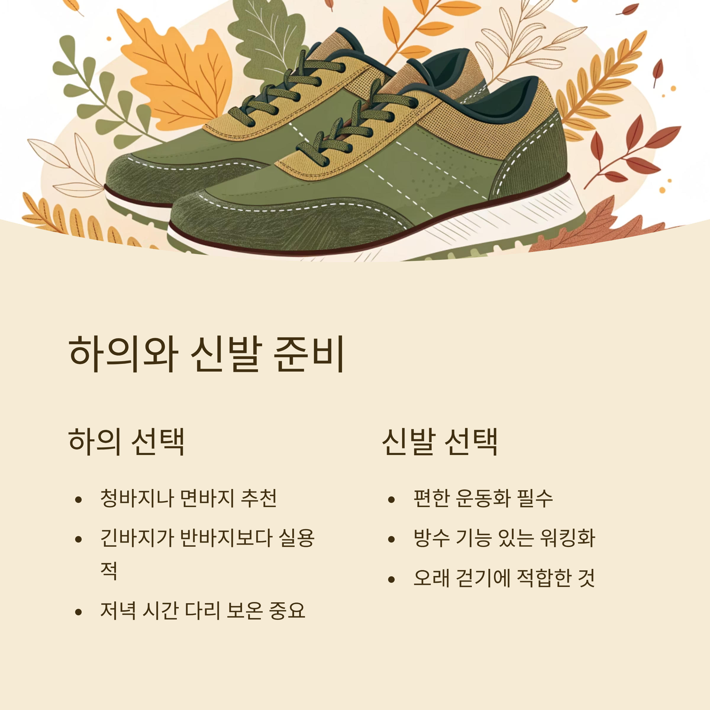 바지는 청바지나 면바지가 가장 무난해요. 낮에는 괜찮지만 저녁에는 다리가 시릴 수 있어 반바지보다는 긴바지가 좋아요. 신발은 편한 운동화나 방수 기능 있는 워킹화가 여행에 적합해요.