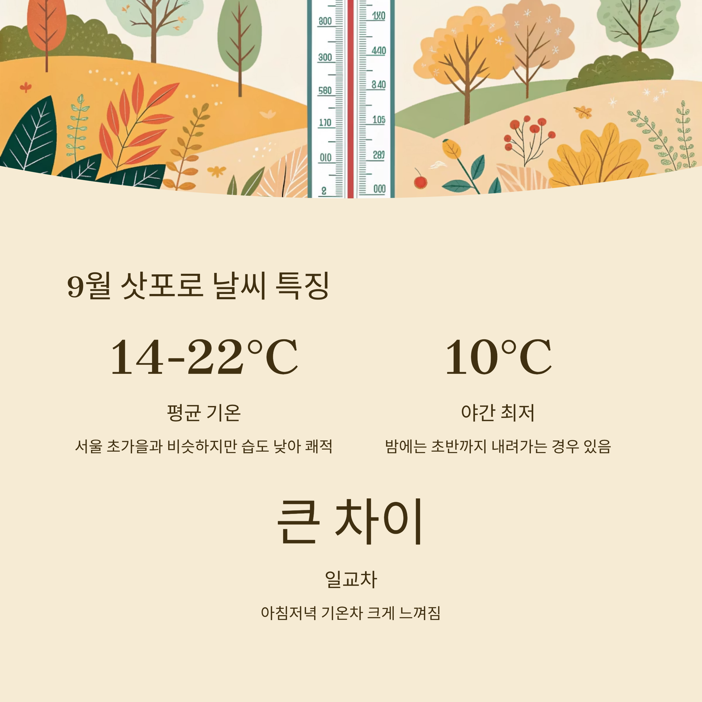 삿포로의 9월은 여름에서 가을로 넘어가는 시기로 아침과 저녁의 기온 차가 크게 느껴져요. 여행을 계획한다면 그 변화무쌍한 날씨에 맞춘 옷차림을 준비하는 것이 중요해요. 낮에는 산책하기 좋은 선선한 기온이지만 해가 지면 긴팔이 꼭 필요하답니다.