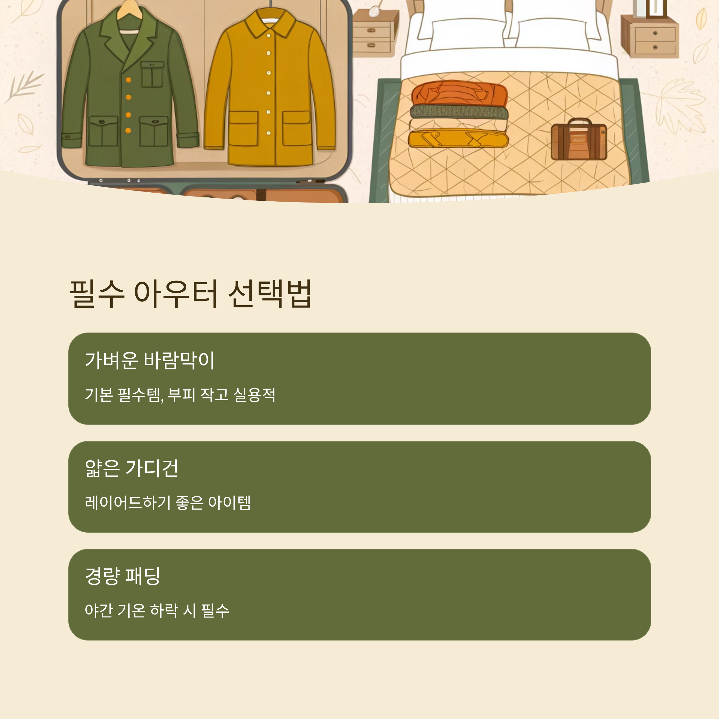 가벼운 바람막이나 얇은 가디건이 기본이에요. 기온이 떨어질 때는 얇은 경량 패딩이나 후드 재킷도 유용해요. 부피가 크지 않으면서도 따뜻한 옷을 준비하면 이동이 편리해요.
