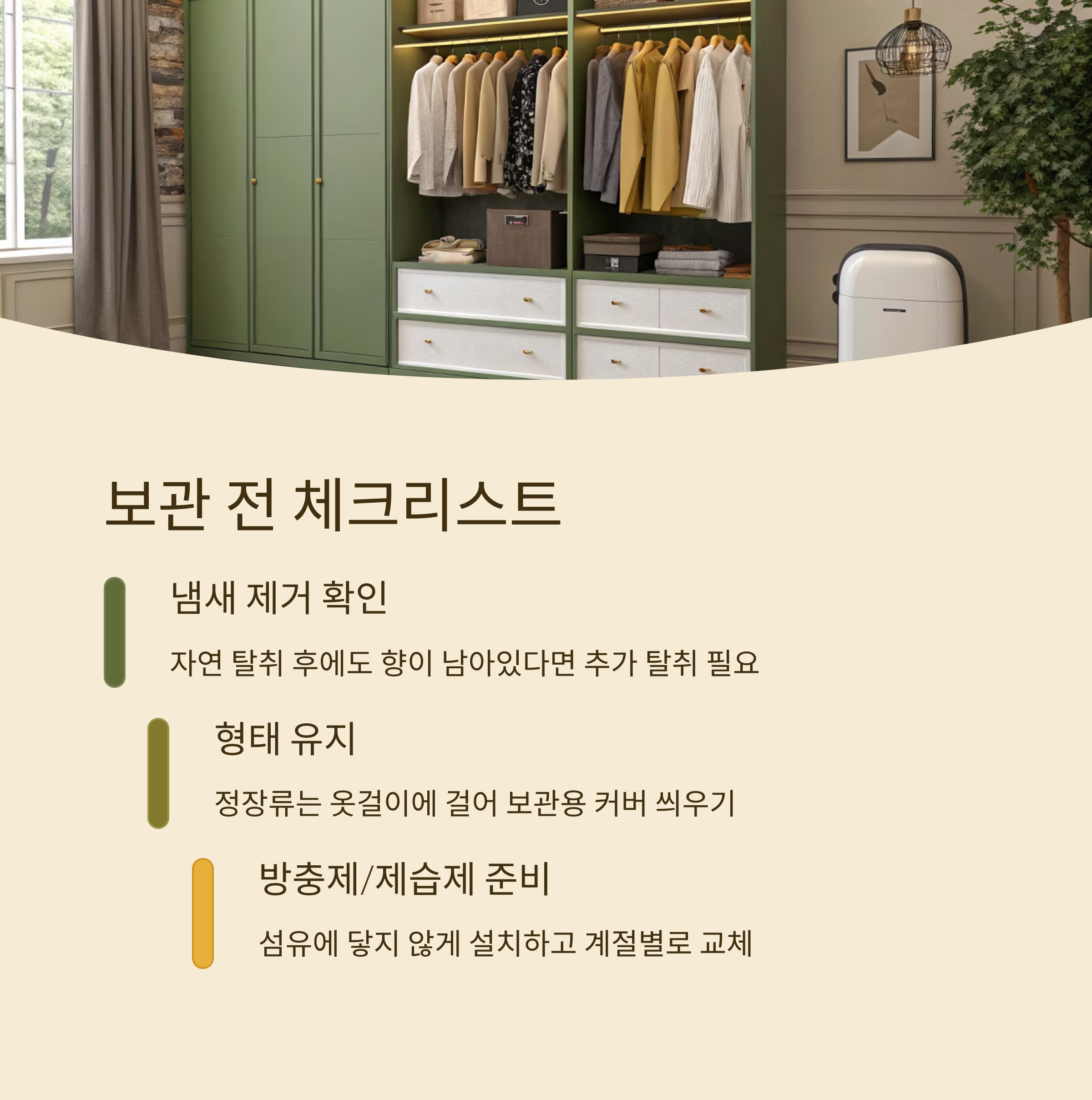 마지막으로 확인할 것은 ‘방충제 및 제습제’ 준비예요. 옷장 속 습기와 벌레는 의외로 큰 적이거든요. 방충제는 섬유에 닿지 않도록 하고, 제습제는 계절별로 교체하는 습관을 들이면 관리가 훨씬 쉬워져요.